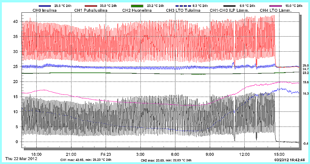 Joka huoneessa ei ole mittaria, mutta esim makkari 22,3 - 22,5 C, TV-huone 23,5 C (kun 40" ei-LED TV on päällä), sauna ja pesuhuone ilman lattialämmityksiä (suurin etäisyys, ilmakanavat eristettynä ullakolla) 21,5 C ja ilmakanavissa, jotka kulkevat lattialaatan alla eristettynä, purkukohdassa 23,5 C (kiertoilmapuhallin 20 Hz).