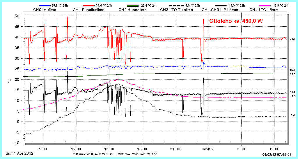 Kylmä tuuli ja 0 C ulkolämpötila vaati Pyyntilämpötilan nostoa yhdellä asteella. Ottoteho nousi heti 459,6 W lukemaan (neljän tunnin keskiarvo, PF 0,78 ) ja jatkuu tasaisena. Katkot ja sulatukset loppuivat. :)