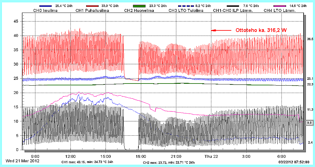 Olosuhteet ovat jokaisessa ILP talossa erilaiset, en ollenkaan epäile felonin raportoimaa katkotonta ajoa. Sijaintikin taitaa olla paljon pohjoisempi hänellä ja minun LTO:n voimakas vaikutus lämmön tarpeeseen voi poiketa huomattavastikin. Auto Mode jne. vaikuttaa tietenkin myös oleellisesti katkokäyntiin. En näe myöskään mitään haitallista katkokäynnissä varsinkin kun se tapahtuu pienillä ottotehoilla. Keski-ottoteho kertoo myös aika paljon olosuhteista. Ei tullut mielestäni irtopisteitä tälläkään kertaa sinulle jviirret.