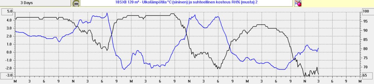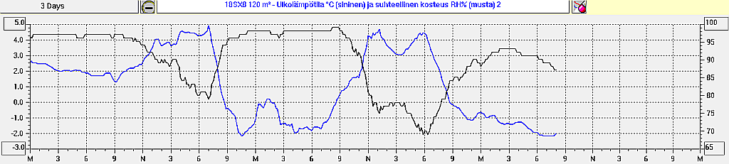 Muutos: Vaihdoin toisen säästä kertovan 3 päivän mittaisen graafin tilalle, jossa sekä lämpötila että kosteus on mukana.
