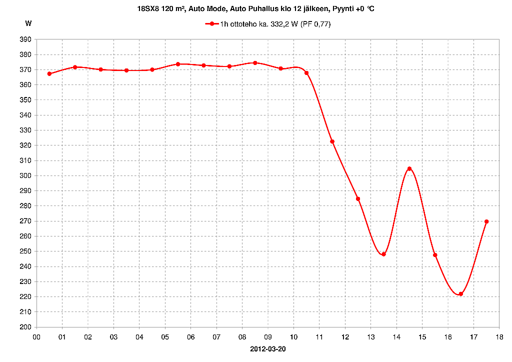 Lisäys: oheinen ottotehon graafi antaa lisävalaistusta arvoisille asiantuntijoille. Ei ole kovin suuri tuo 220 W alin ottoteho yhden tunnin keskiarvona.