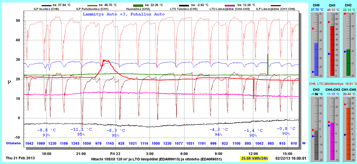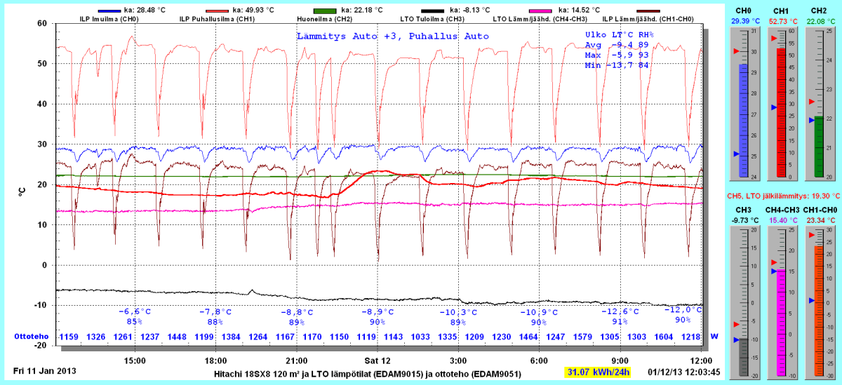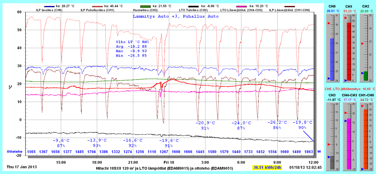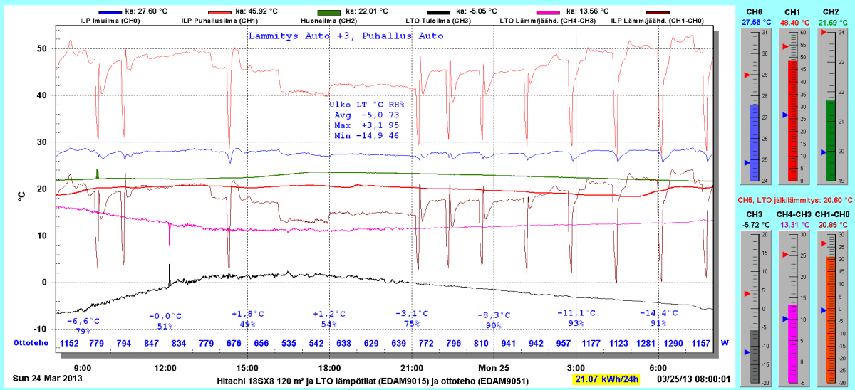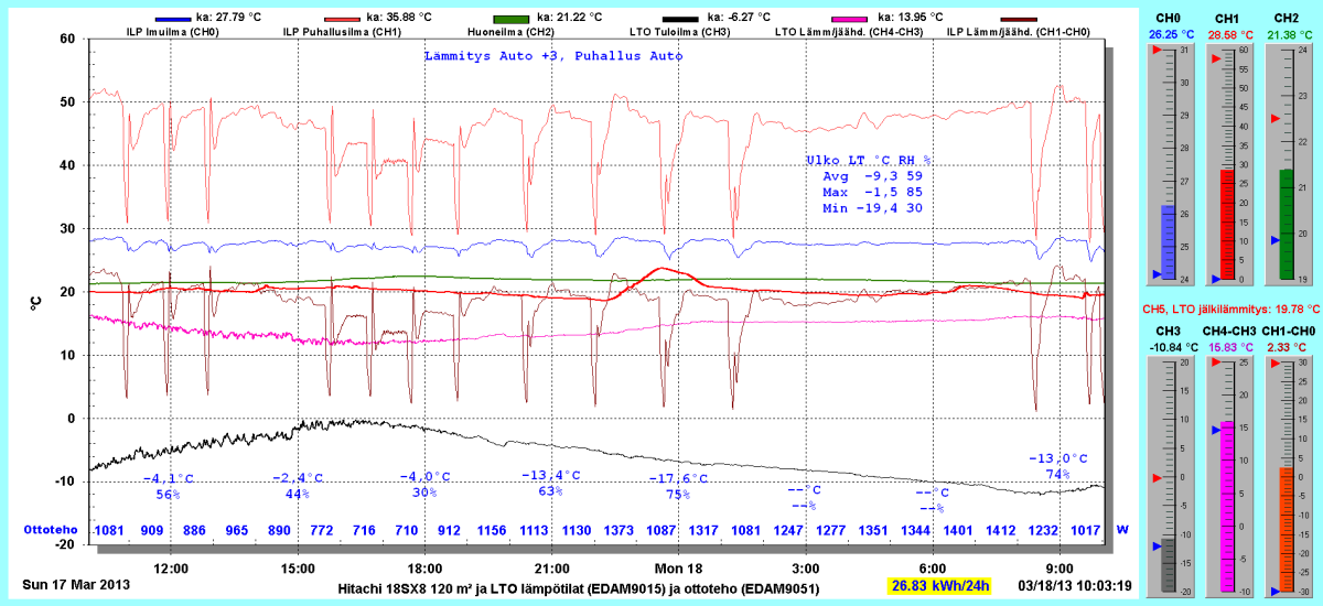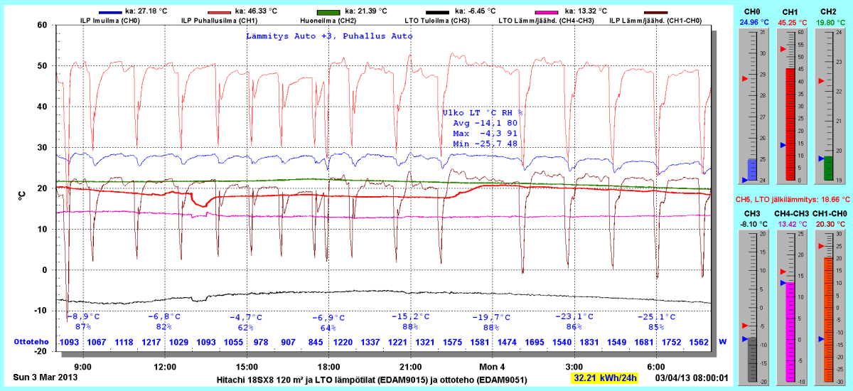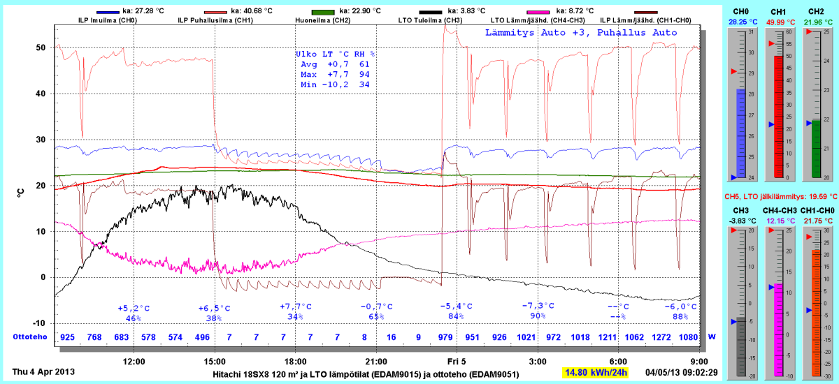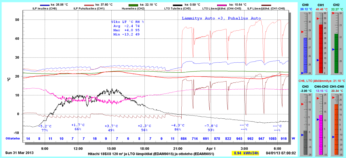 Pikkupakkasilla mennään tasaisesti sulatellen. Pienemmällä lämpötilapyynnillä (Auto +2) putosi puhalluslämpötila ja imulämpötila aluksi tietenkin enemmän ja asettui jatkossa ulkolämpötilan mukaan. Puhallus on nyt ihan sopiva Auto asetuksella. 24 tunnin keski-ottoteho oli koko mittausjaksolle 883W ja ulkona -4,0 C.