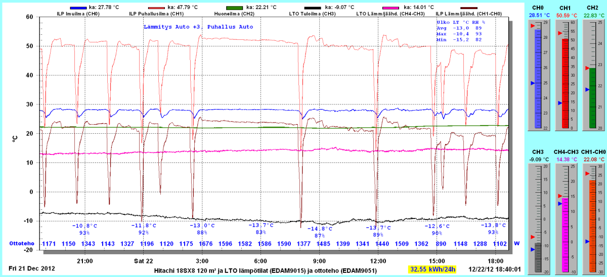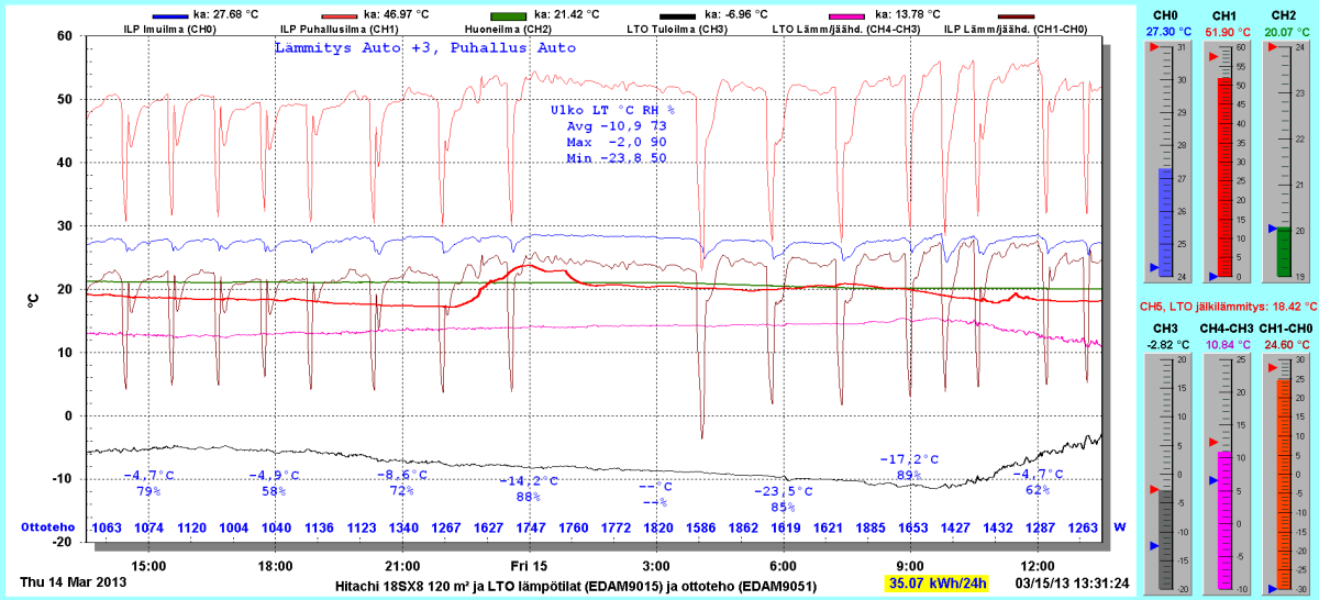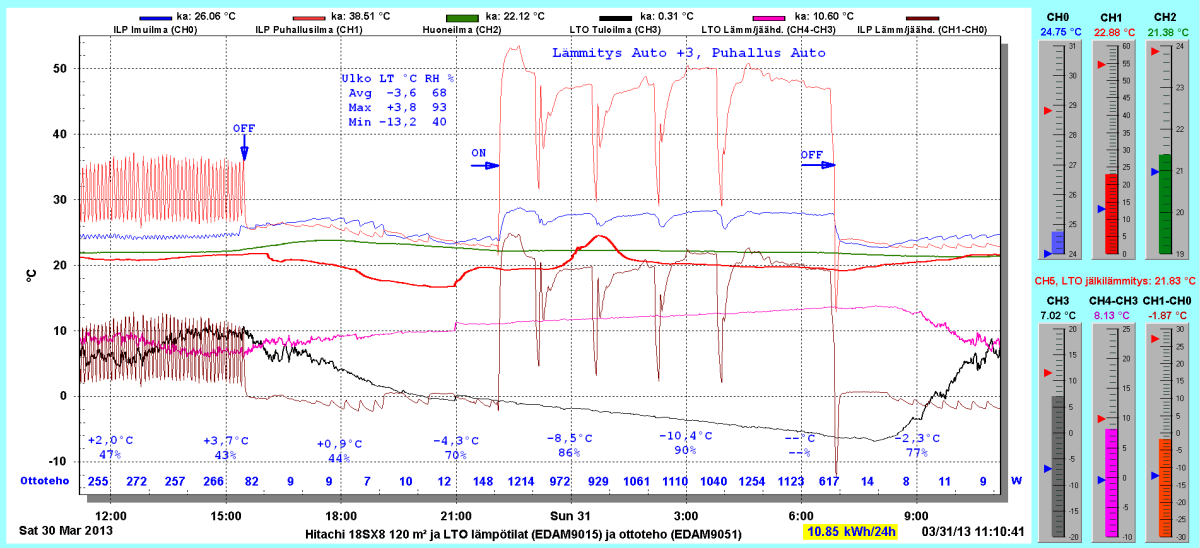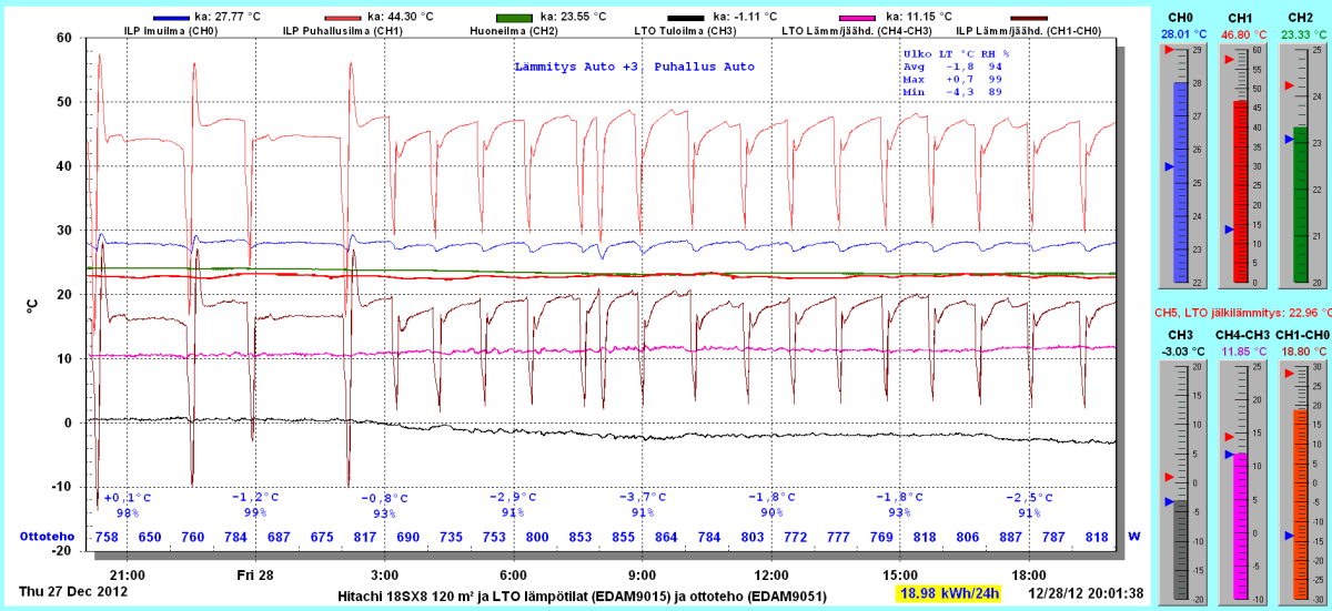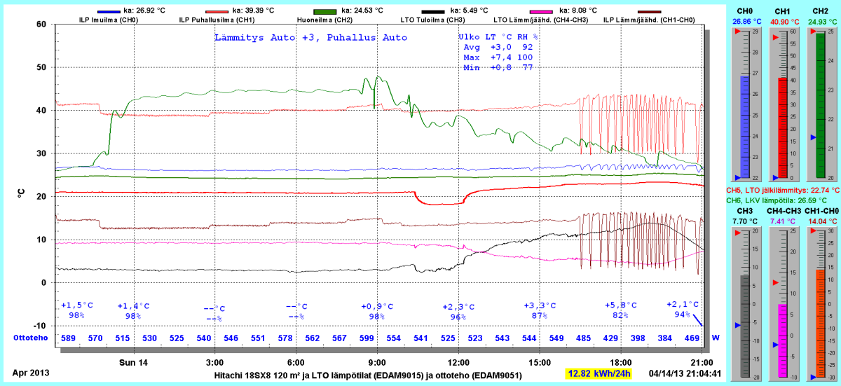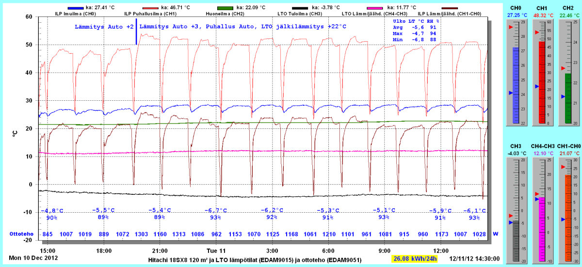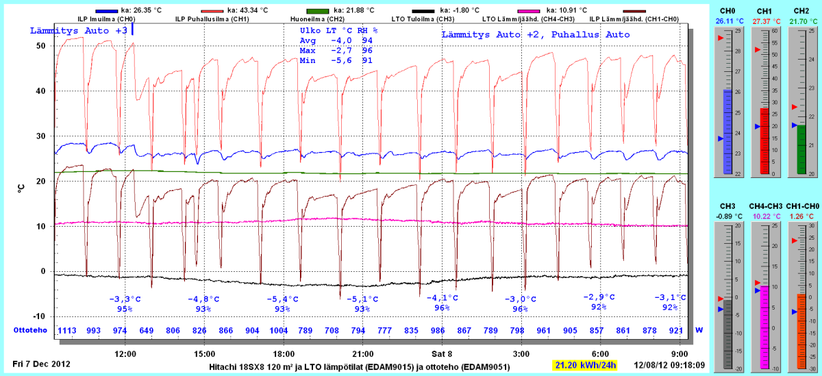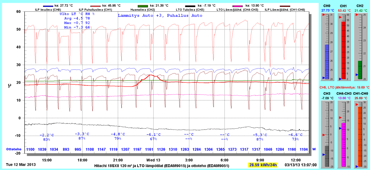Pikkupakkasilla mennään tasaisesti sulatellen. Pienemmällä lämpötilapyynnillä (Auto +2) putosi puhalluslämpötila ja imulämpötila aluksi tietenkin enemmän ja asettui jatkossa ulkolämpötilan mukaan. Puhallus on nyt ihan sopiva Auto asetuksella. 24 tunnin keski-ottoteho oli koko mittausjaksolle 883W ja ulkona -4,0 C.