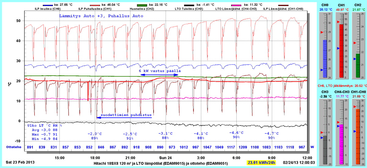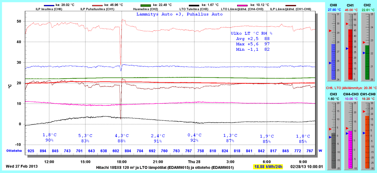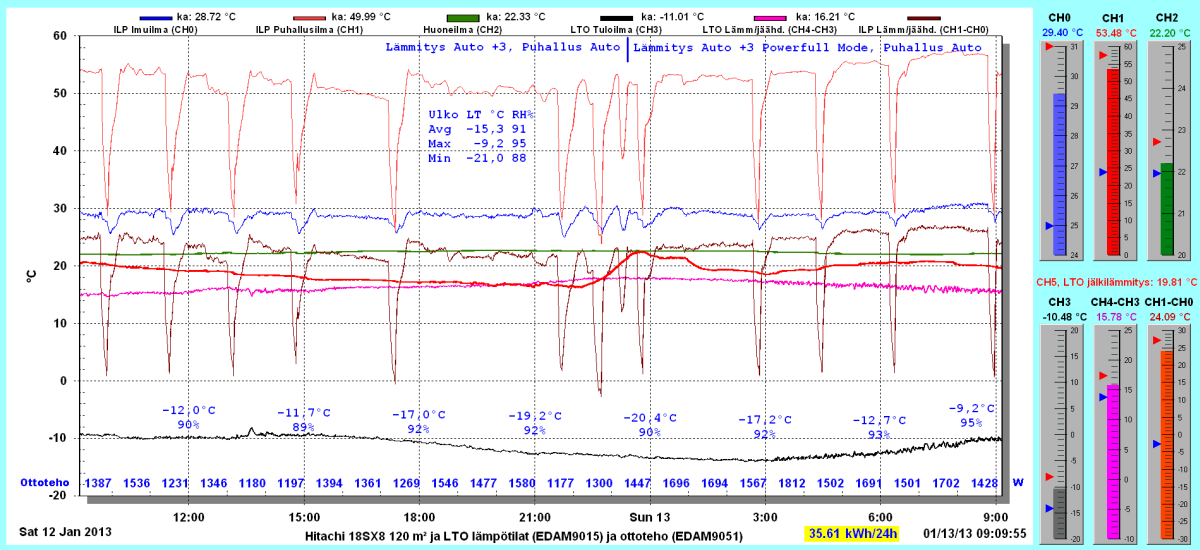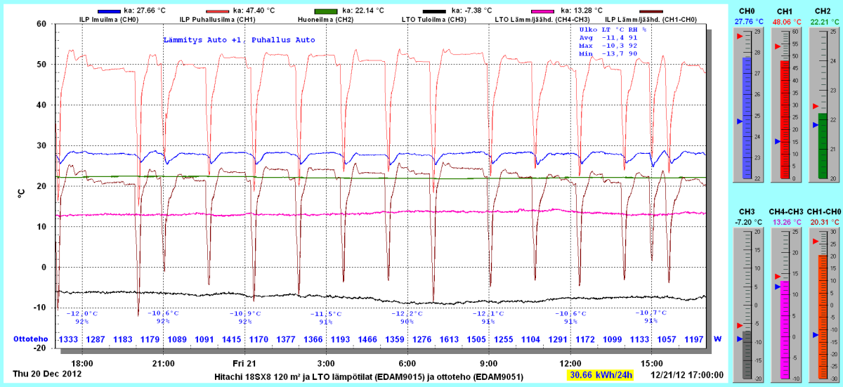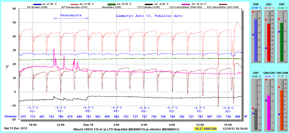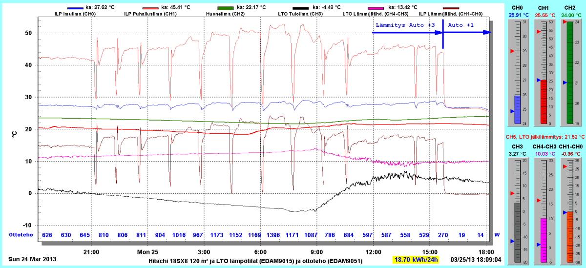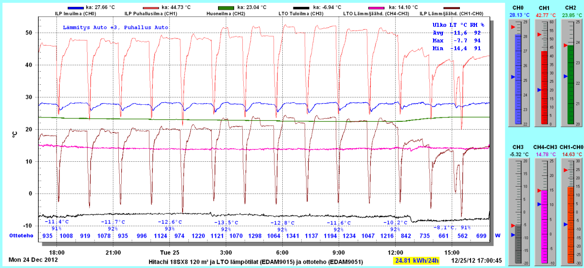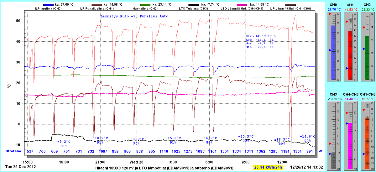 Pikkupakkasilla mennään tasaisesti sulatellen. Pienemmällä lämpötilapyynnillä (Auto +2) putosi puhalluslämpötila ja imulämpötila aluksi tietenkin enemmän ja asettui jatkossa ulkolämpötilan mukaan. Puhallus on nyt ihan sopiva Auto asetuksella. 24 tunnin keski-ottoteho oli koko mittausjaksolle 883W ja ulkona -4,0 C.