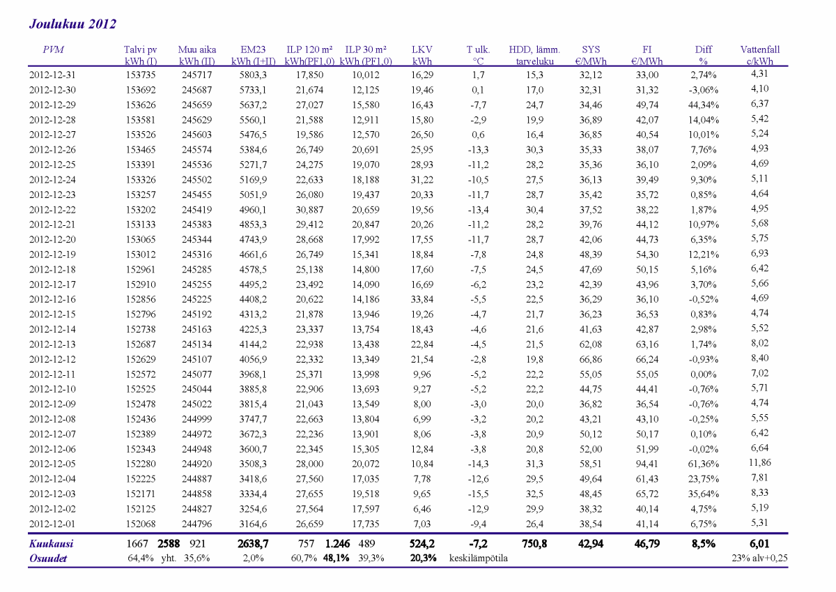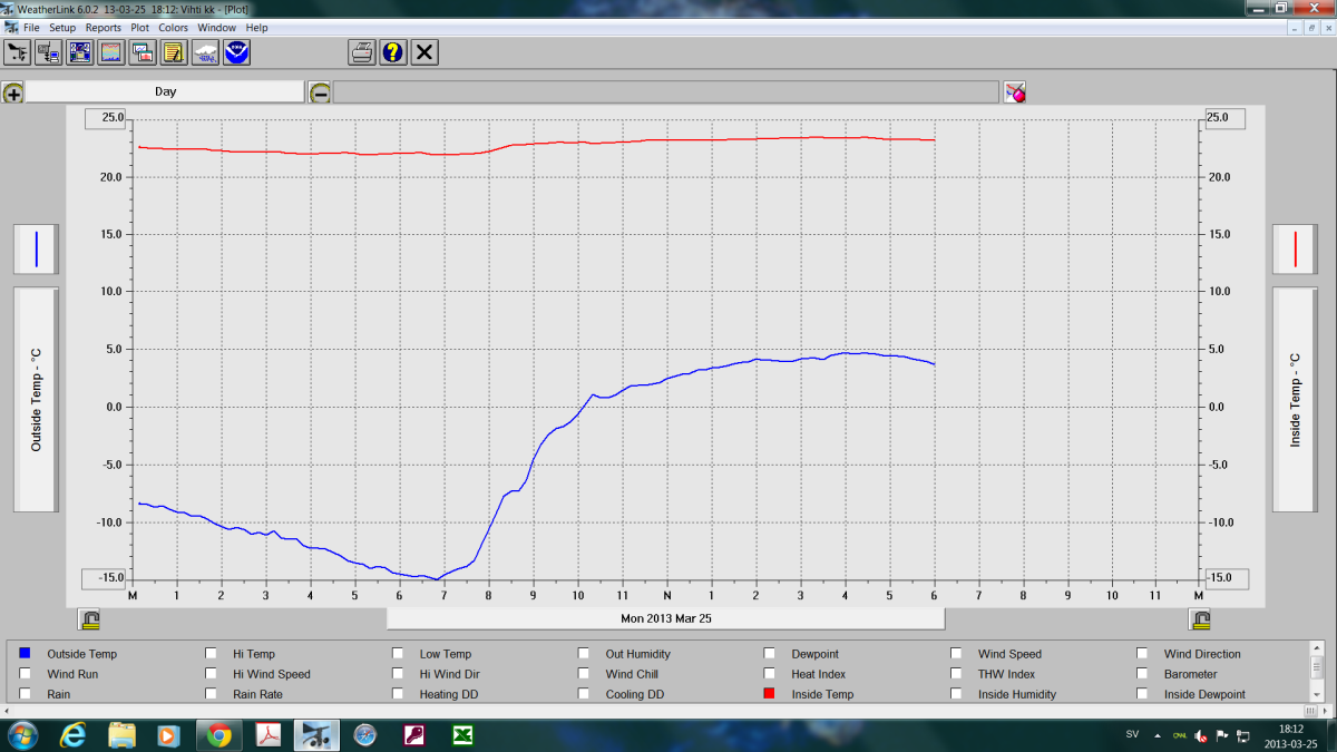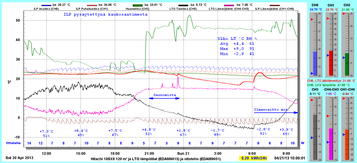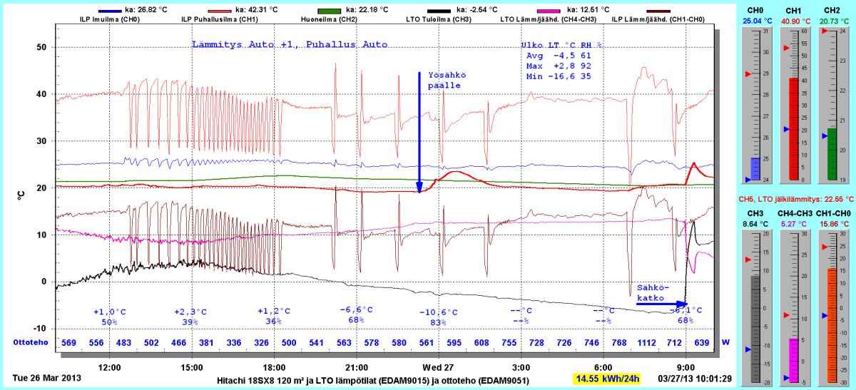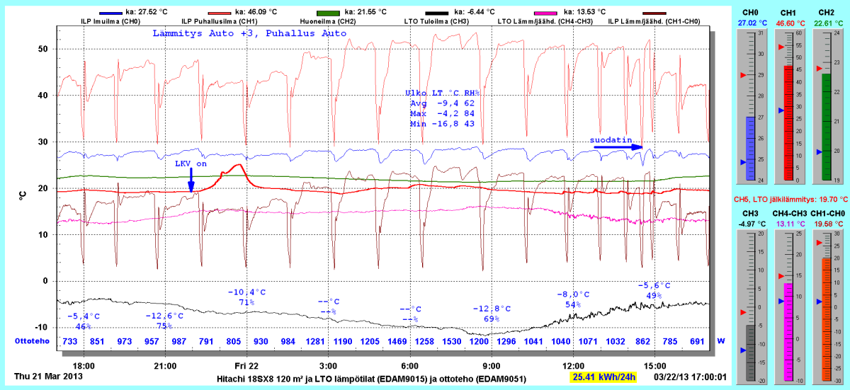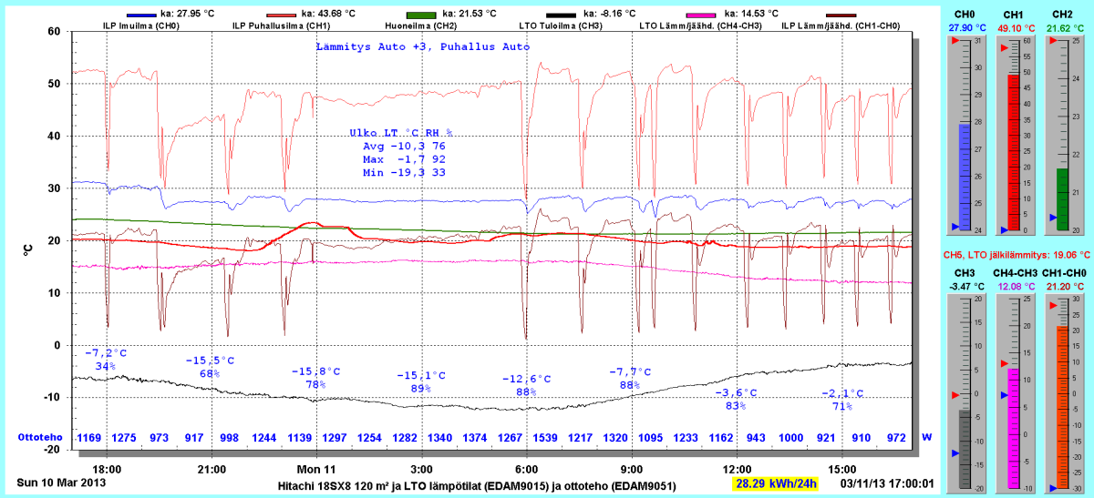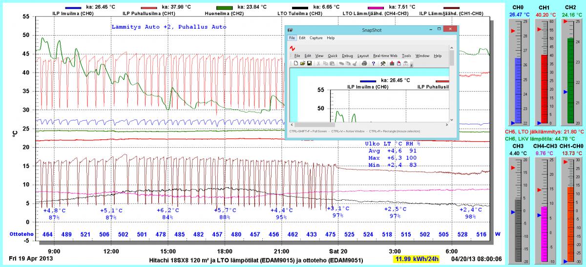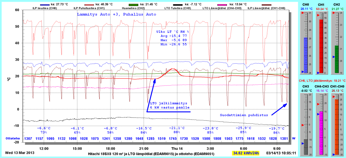Pikkupakkasilla mennään tasaisesti sulatellen. Pienemmällä lämpötilapyynnillä (Auto +2) putosi puhalluslämpötila ja imulämpötila aluksi tietenkin enemmän ja asettui jatkossa ulkolämpötilan mukaan. Puhallus on nyt ihan sopiva Auto asetuksella. 24 tunnin keski-ottoteho oli koko mittausjaksolle 883W ja ulkona -4,0 C.