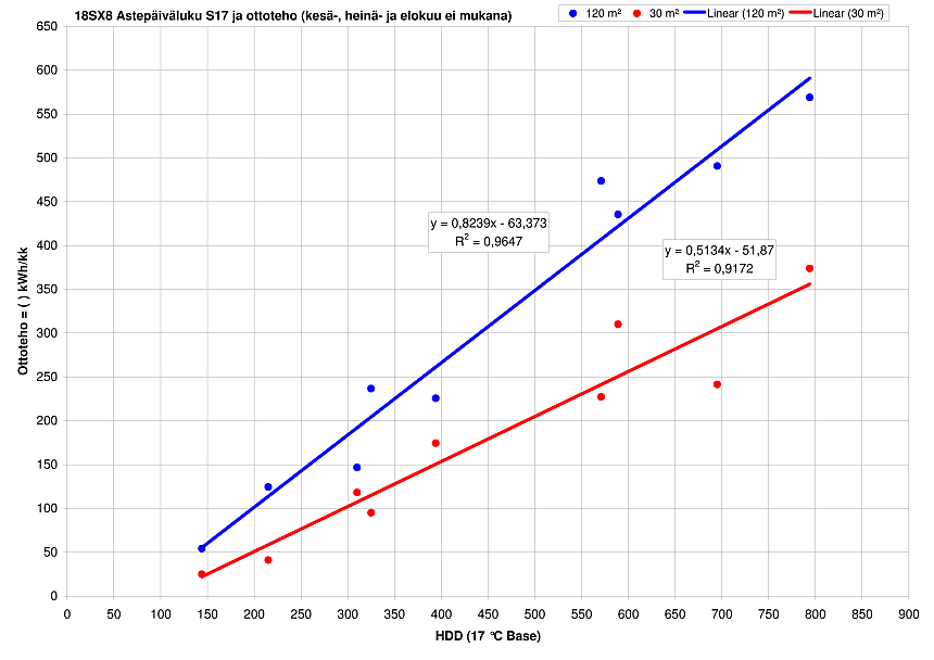 josta 18SX8 120 m2 = 3000 kWh ja 18SX8 30 m2 = 1700 kWh (PF 1,0 mittauksella, todelliset noin 20% vähemmän).