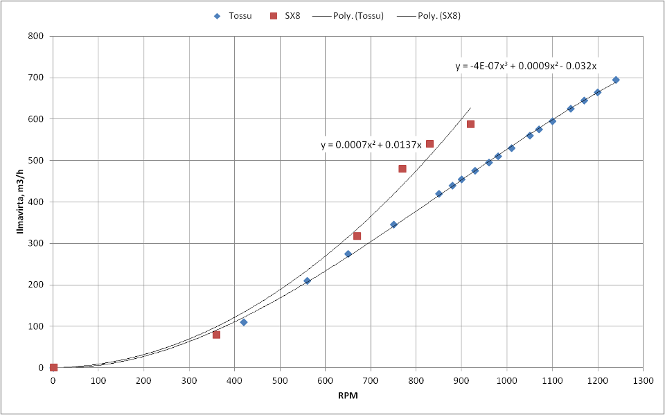Sen sijaan 18SX8:n pisteet sijoittuvat vähän miten sattuu. 1-nopeuden ilmamäärä näyttäisi olevan liian pieni ja 2 ja 3-nopeuden liian suuri. Oletettavasti 4-nopeuden ilmamäärä on oikein koska se esitetty myös Ahlsell:n ruotsalaisessa esitteessä. Toki on myös mahdollista että 4-nopeuden ilmamäärä 588m3/h olisi super-hi nopeuden 1040 rpm ilmamäärä.