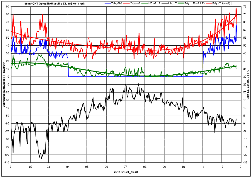 Sähköä tulee menemään yhteensä Fortumin mittarin mukaan 15700 kWh, josta 18SX8 120 m2 = 3000 kWh ja 18SX8 30 m2 = 1700 kWh (PF 1,0 mittauksella, todelliset noin 20% vähemmän). Keskilämpötila 2011 tulee olemaaan täällä +6,5 C.
