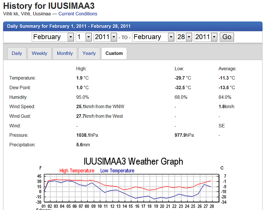 Saattaa tulla liikaa toleranssia kuten tuossa keskilämpötilassakin -5.85 oC sitä on kosolti desimaaleista huolimatta, sillä kk astepäiväluku 800 tarkoittaisi käytännössä siinä -9 asteen kk keskilämpötilaa. :cool: