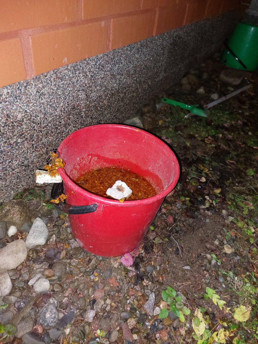 Vettä oli vajaa puolillaan 10L ämpärissä ja sahanpurua kellumassa, jotta ei tajua että on vettä. Leikkele oli styroksissa kiinni rautalangalla, mutta joku oli vienyt joka murenan. Miten hitossa joku on voinut operoida noin tarkasti ja epäilemättä hetken kestänyt homma.