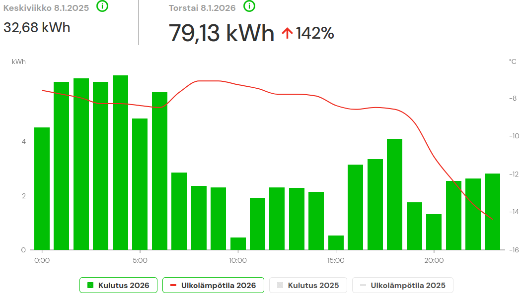 Mutta jos alkaa hakemaan säästöjä pörssisähkön tai aikasähkön kautta niin tahtoo max tehot väkisin nousta. Jonkun 9 tunnin aikana pitäs saada tehtyä kaikki isommat kulutukset.
