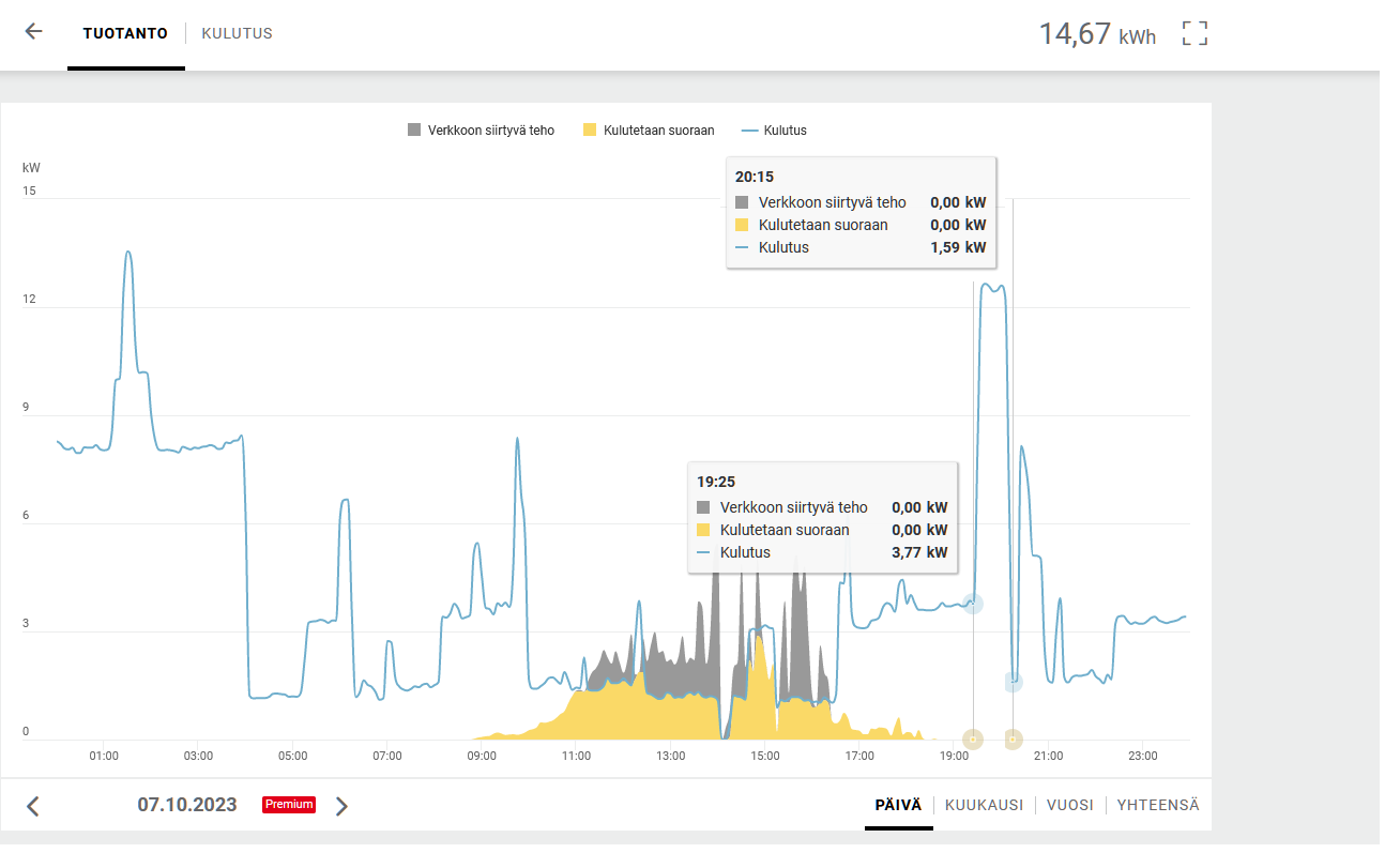 Sama merkki ja kiukaalla ikää n. neljä vuotta. Kivien määräkin on mielestäni sopiva. Edellinen kiuas oli 10 kW Kastor ja se oli kyllä ihan omaa luokkaansa. Viimeksi lauantaina saunottiin ja vuorokauden kulutus oli 58 kWh, muina viime viikon päivinä 33-44 kWh.Kannatta vaihtaa kiuas. itsellä 9kWnen Narvilainen lämpiää sauna 45min 75 asteeseen . Kuvassa "saunapäivä" 19.25 sauna päälle ja 20,15 napsahtaa termostaatti ylläpidolle. Sitten hetken ylläpito päällä kun löylytellään.