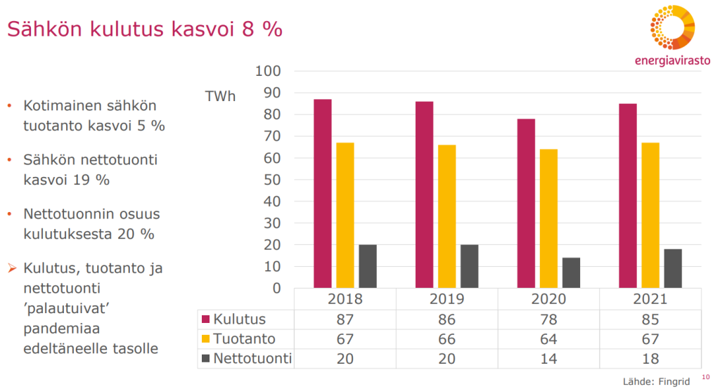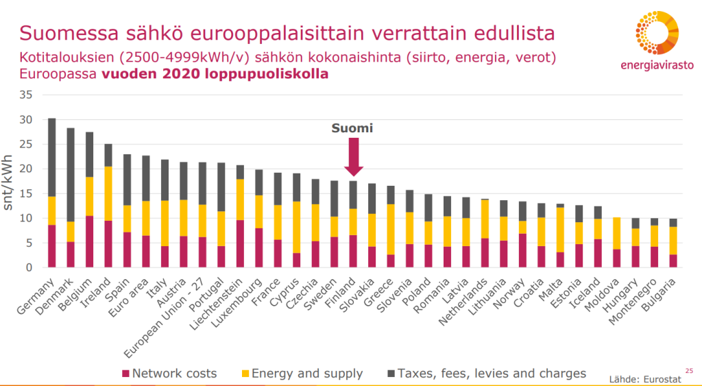 Kotitalouksien sähköstä maksama kokonaishinta nousi 25,1 prosenttia vuonna 2021, sähkölämmittäjien lasku kasvoi 35,3 prosenttia. Sähköenergia kallistui voimakkaasti, mutta siirtohinnat olivat viime vuoden pienessä laskussa.