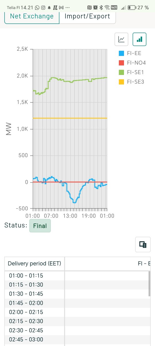 Jaaha siellä menee Liettuassa merkittävä MW-määrä (732 MW) edullisemman hinnan alueelle SE3. Eilen meni koko päivän "väärään suuntaan" sähköä tuolla.