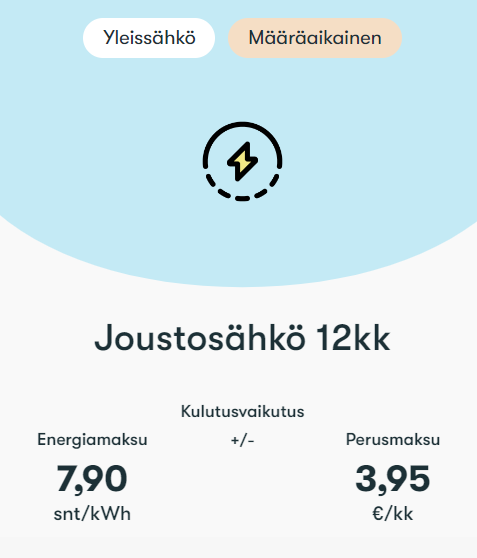 ja 12 kk 7,90 snt/kWh + 3,95 €/kk