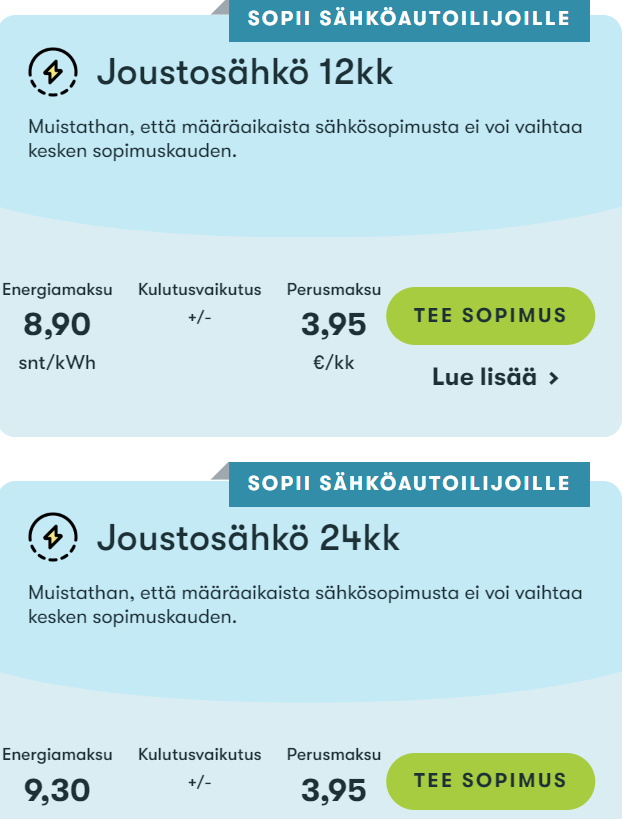 Ok firma. Viimeiset 2 vuotta kohta asiakkaana 4.95snt hinnalla. Jatkoon tarjosivat ryöstöhinnoin yli 9snt 24kk sopimusta ja ei löytynyt 6kk sopimusta yli talven pitkäikäiselle asiakkaalle. Näin ollen siirryin PKS tiimiin.Eilen puhelimessa saatu 12kk 2,99e/kk & 9,11 snt kun kysyin ns. vanhalle asiakkaalle.