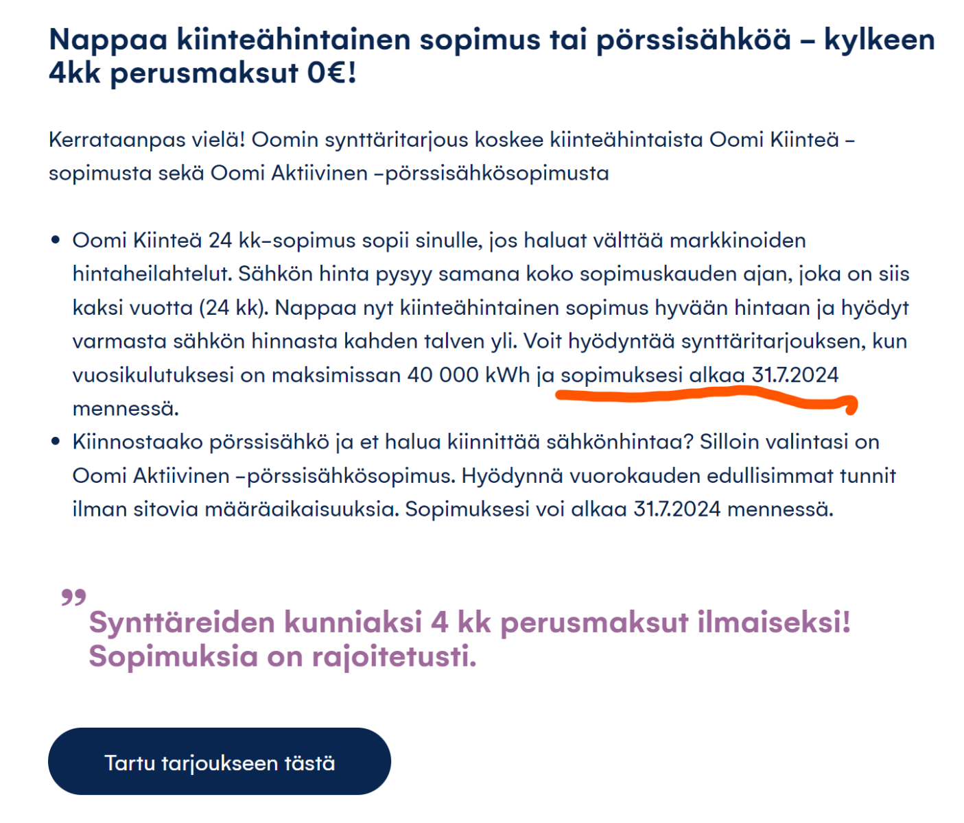 Oomin määräaikainen loppuu 31.7.2024 ja Väreen KV-sopimus alkaa 14.9.2024. Tein Oomin nettipalvelussa pörssisähkön alkavaksi 1.8.2024. Kaikista on tullut sopimusvahvistus.