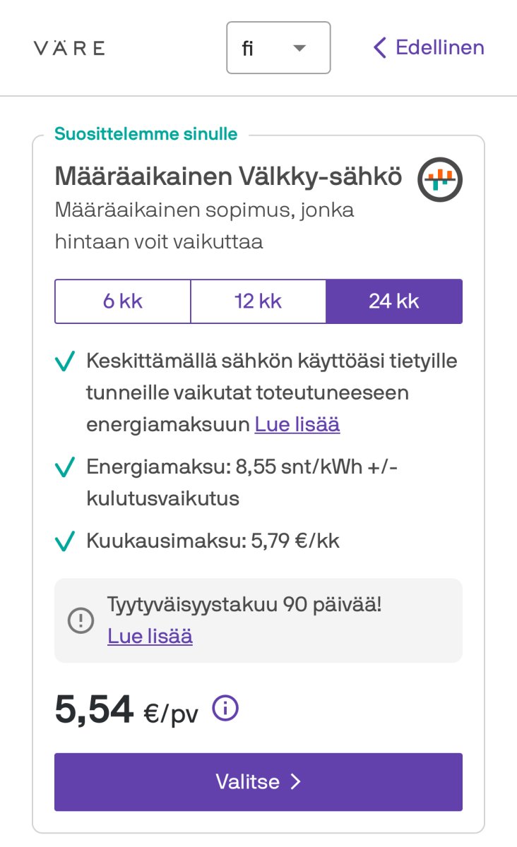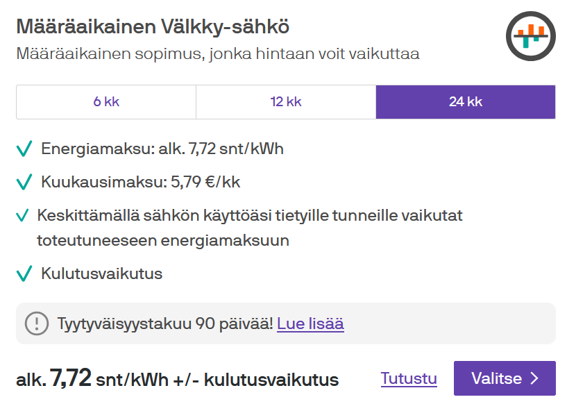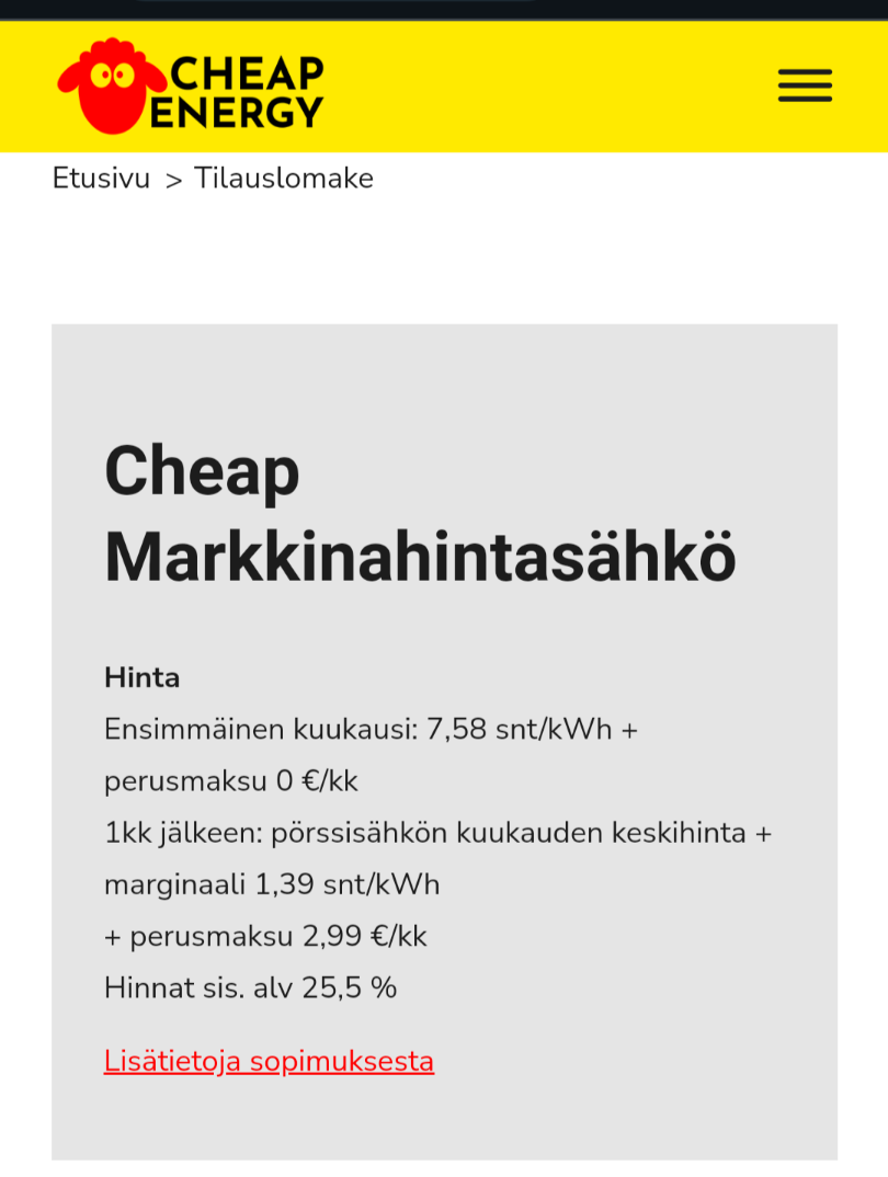 Peruslinjaa joo. Kokkolan energian 6kk kamppanja 7,8snt/kwh soppari päättyy 27.1-25 jonka jälkeen jatkuu pörssillä automaattisesti mikäli ei jatkoa tee. Lupasivat toki heittää jatkotarjouksella vuodenvaihteessa. Uskoisin että 6kk jatkotarjous vois olla jotain tyyliin 9,5 snt/kwh. Ei tuo jatko pörssilläkään poissuljettu ole, sen verran maltillista hinta on siellä ollut nyt.Peruslinjaa