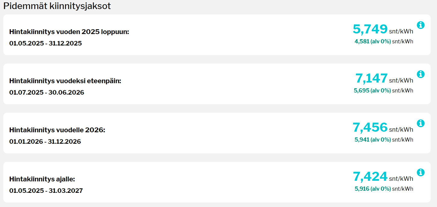 Helen tarjosi jo helmikuussa 6,55 snt kiinteää ad 30.9.26.Ei vielä Helen tarjoa alle 7snt. Oma arvioni on, että myös Helen tulee muutaman viikon sisällä tarjoamaan 12/24kk kiinteää sopparia 6,xx hintaan.