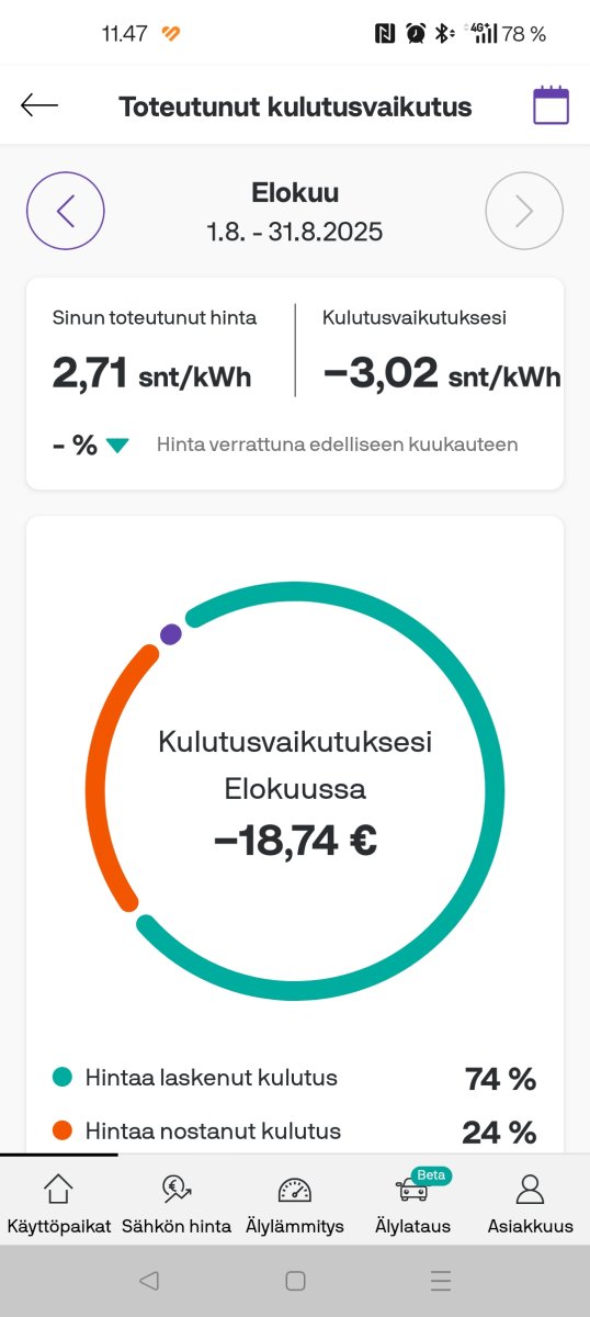 Jos saisi jonkun 4 snt/kWh + 0 € perusmaksulla olevan sopimuksen ja kun oma kulutus on noin 5000 kWh/vuosi kulutuksella sähkö maksaisi siirtohintoineen 614,22 €/vuosi. Nykyisellä aidosti kiinteällä 6,99 snt/kWh + keskimääräisellä 1,50 € perusmaksulla sähkö maksaa 781,72 €/vuosi. Eroa 167,50 €/vuosi, noin 46 snt/päivä. Ei vaan jaksa noiden pörssisoppareiden kanssa toimia, kun vielä oma kulutus painottuu jonnekin klo. 16 – 22 välille. Sauna ja hella menee päälle ja sähköhammasharjat ladataan silloin kun huvittaa. Säästetään sitten jostain muusta.