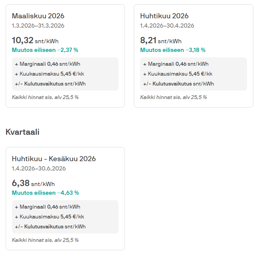 Tässä markkinamiehet ovat tehneet pelottavan hyvää työtä kun ovat saaneet kansan uskoteltua että kv-soppari suojaisi jotenkin kalleimmilta tunneilta. Se suojaa vain ja ainoastaan kuukauden kalliilta keskihinnalla ja kulutuksen ajoituksesta saa tasan saman euromääräisen hyödyn kuin pörssisopparillakin.