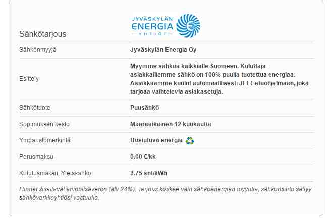 harald sanoi:Ovat taas energiamyyjät aktiivisia. Pari soittoa tullut viikon aikana, en kuitenkaan tykkää tehdä puhelimessa sopparia. Tuli kuitenkin taas surffattua sahkonhinta.fi, siellä oli taas uusia pelaajia: