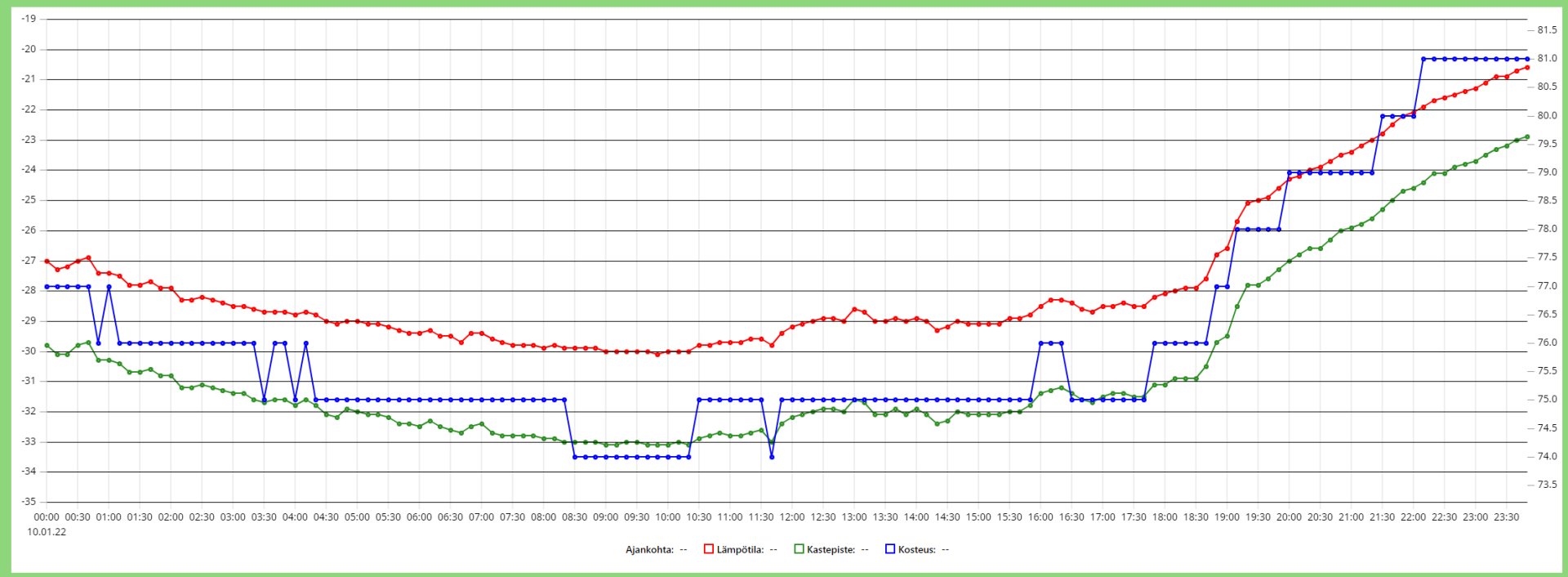 Naruskan lähimaastoissa asuneena tulee seurattua alueen lämpötiloja. 2022 on tähän mennessä ollut neljä vuorokautta, jolloin lämpötila käynyt alle -30 C:n. Kylmin vuorokausi on ollut -29 C keskilämpötilaltaan. Keväällä kun menin mökille mittari näytti tasan -20C.Missä näin kylmä paikka on Suomessa? Sallan Naruska on kylmä mutta ei taida riittää sekään. 2vko -30 astetta on superkylmää. Ainakin käytännössä kaikki ihmiset asuvat lämpimämmässä paikoissa.