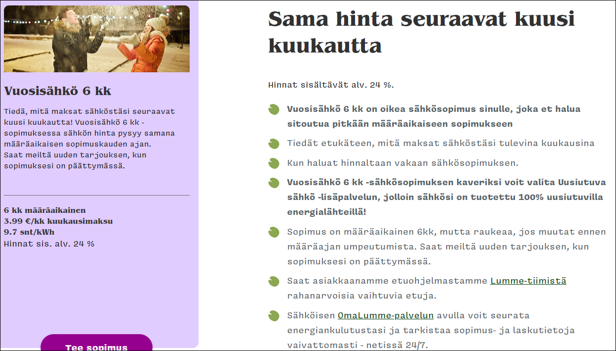 Näin tekivät minullakin 2021 heinäkuussa kun solmin 2v määräaikaisen alkamaan 1.11.2021. 3kk alkamisesta tuli vahvistukset ja sain tarjoushintaan 4.95snt/kwhMinulle vastasivat sähköpostissa että sopimusvahvistus lähetetään kun sopimus alkaa. Tein OmaLumme-tunnuksen ja siellä tilaamani 6kk määräaikainen sopimus kuitenkin jo näkyy. Alkaa 1.10 kun Oomin määräaikainen loppuu.