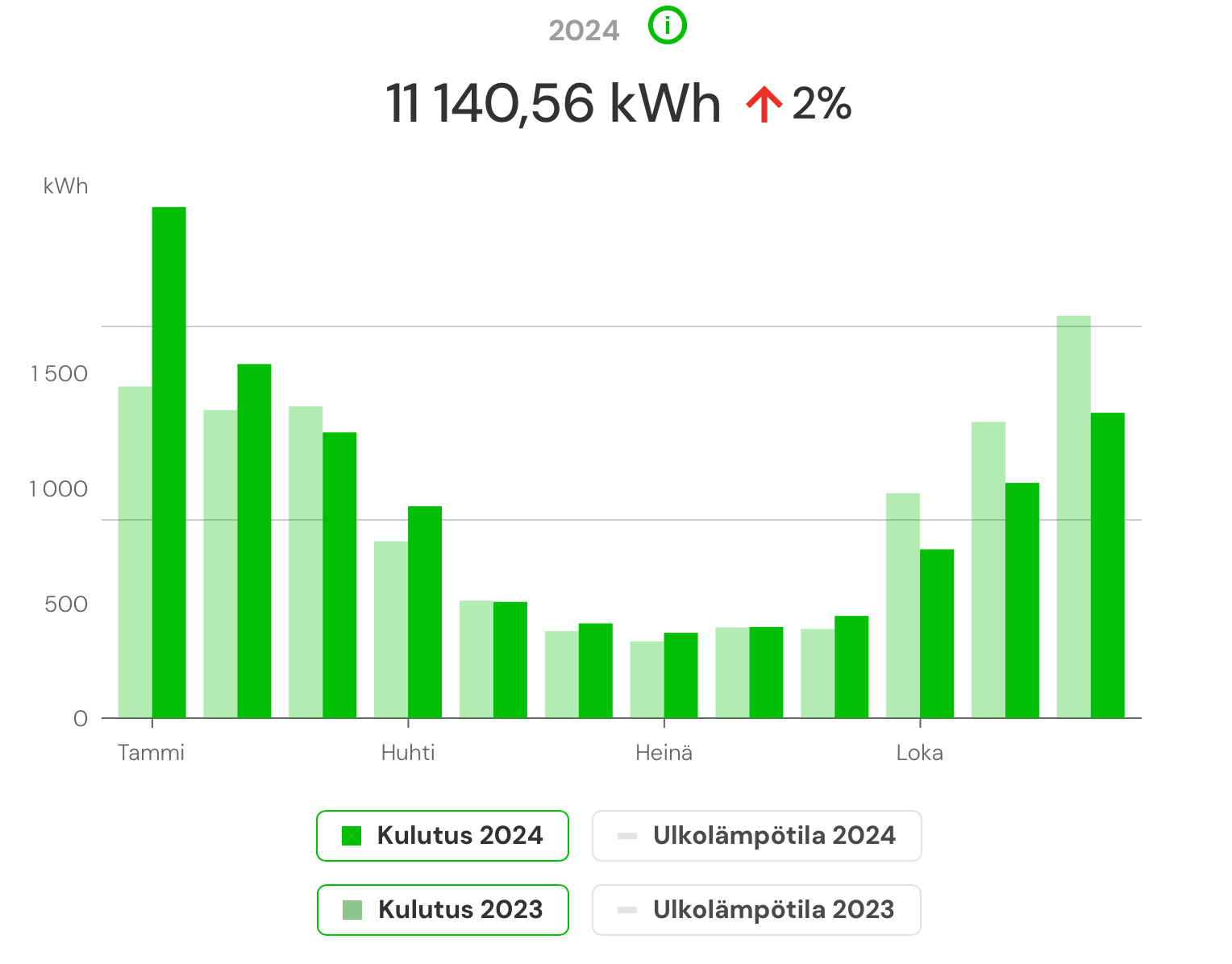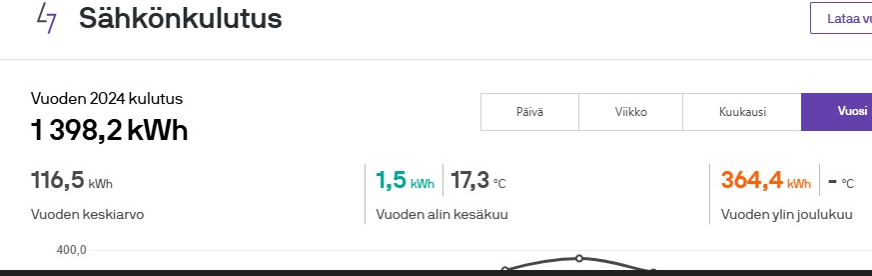 2024: 13974kWh, josta sähköauton latausta 2594kWh, eli "oikea" kulutus 11380kWh