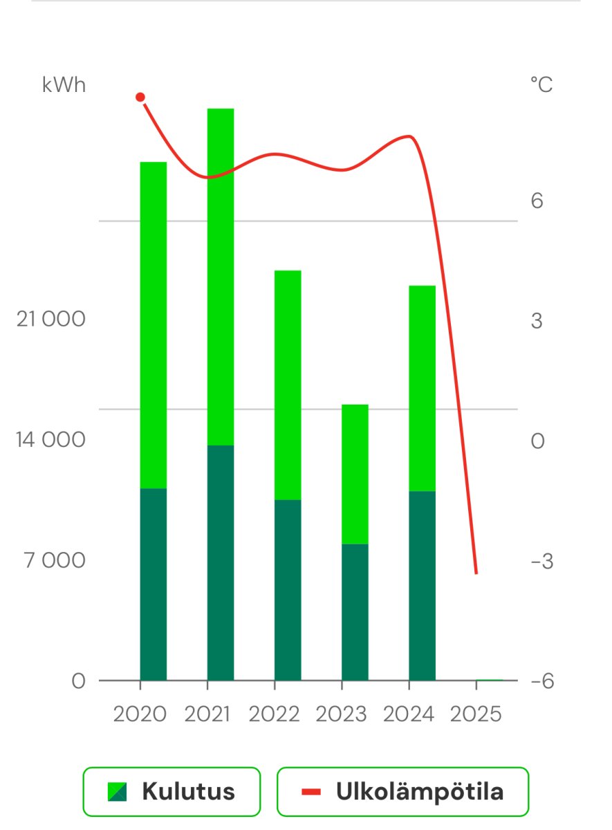 Vuosina 2018, -19, -23 ja hiukan myös -24 ollut ylimääräistä kulutusta kun mm kylmää autotallia pitänyt lämmittää, maata sulattaa viemärin päältä ja viemärivesivahingon jälkiä kuivattaa 1-2:lla 3kW raksapuhaltimella. Muuten ei tuo viimeisin laajennus näy kulutuksen lisääntymisenä.