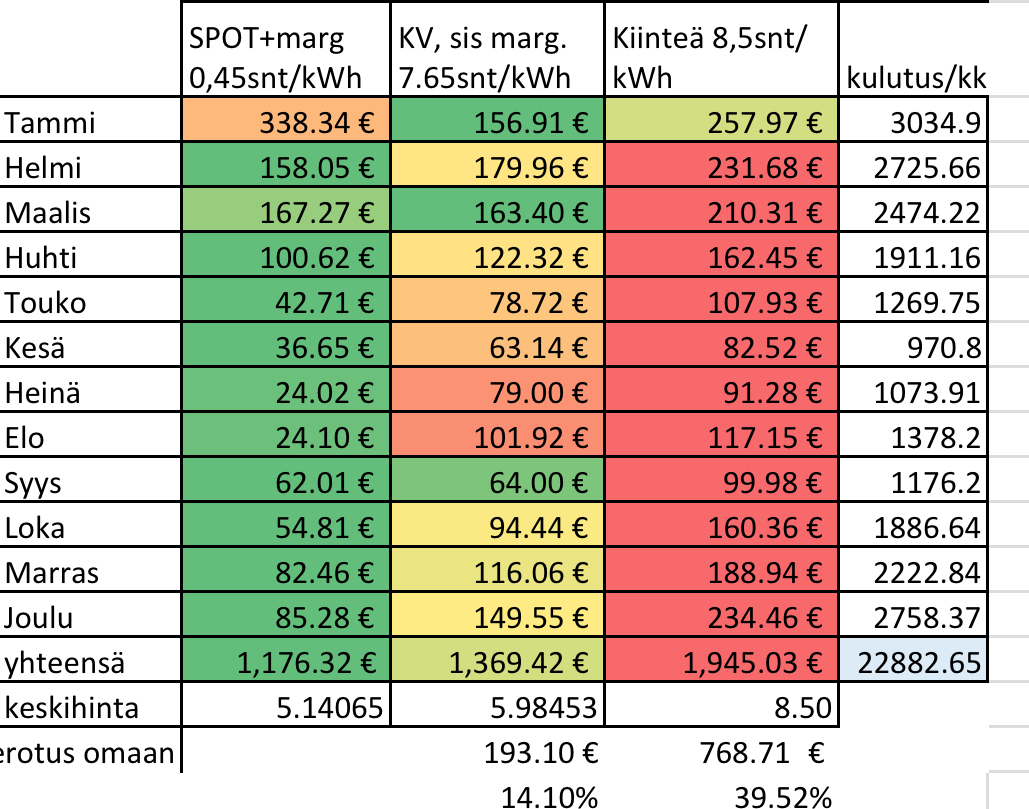 Viime talvi oli minulle ensimmäinen talvi tässä talossa ja kyllä hirvitti että paljonkohan kuluttaakaan (pörssi)sähköä, mutta aika kohtuudella selvittiin kuitenkin. Tammikuussa meni 2010 kWh kun taas elokuussa selvittiin 199 kWh:lla. Aika iso ero suurimman ja pienimmän kulutuksen kuukausilla. Alkuvuosi mentiin pörssisähköllä ja heinäkuun lopussa vaihtui 6kk:n kiinteähintaiseen jolla nyt viidessä kuukaudessa tullut takkiin 96€ :D. Koko vuodelta pörssisähkön keskihinnaksi olisi tullut 7,5 snt (sis. marginaalin 0,41). Ainoa "optimointi" on että LVV lämpiää Pörssärin ohjaamana vain halvimmilla tunneilla. Talossa ei kauaa kärsi pitää lämpöjä pois päältä kun alkaa viilenemään niin nopeasti.