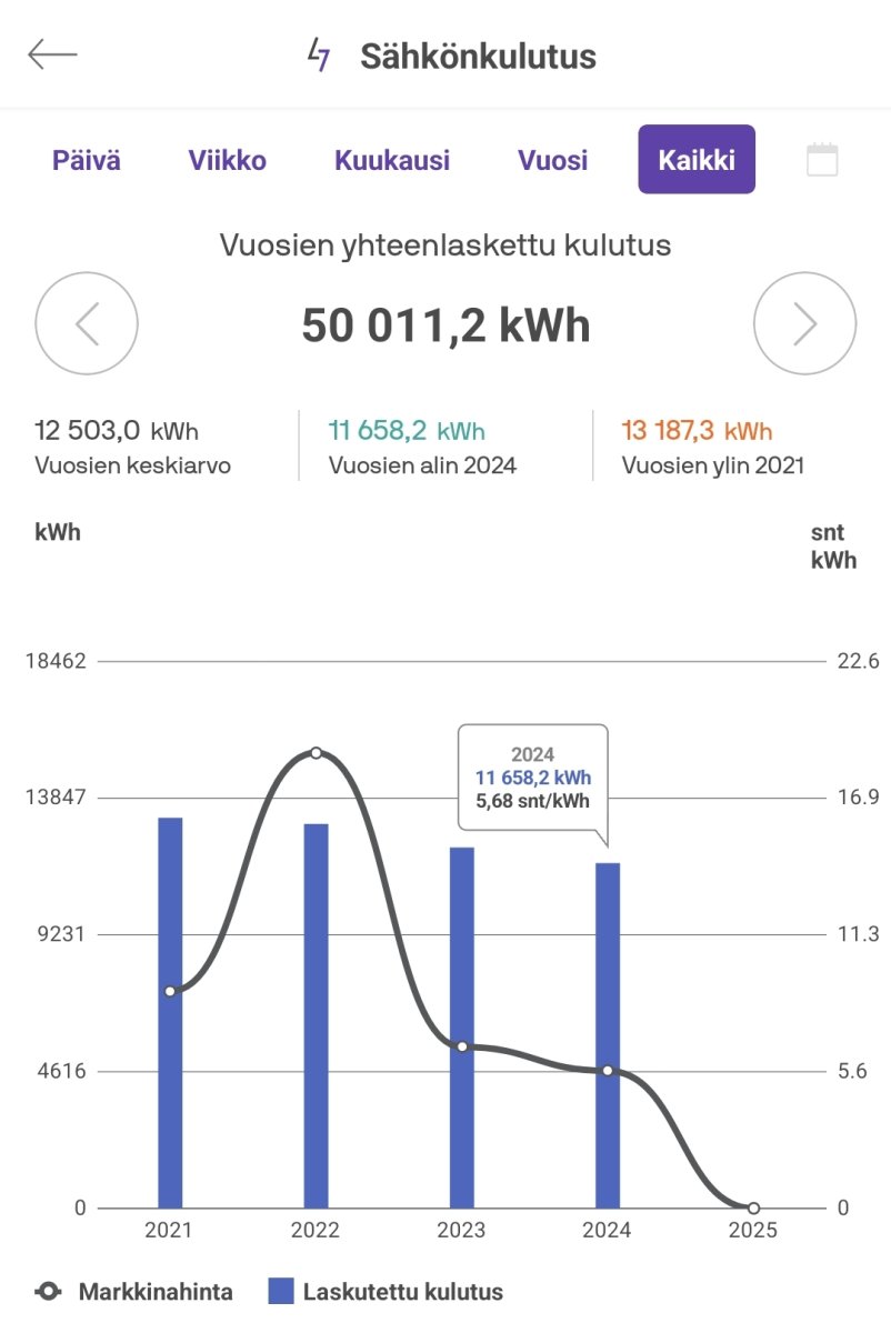 Siinä se on heilunut 15...18MWh vuodessa, nyt 2023 oli 3. perättäinen vuosi kun kulutus on pienentynyt, kenties 2024 tulee uusi minimi jos noista paneleista tosiaan saadaan se kaavailtu kesän kulutus about kokonaan.