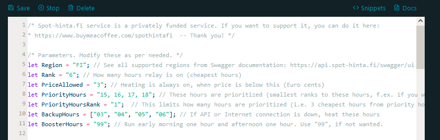 Edit2. Jatkan tähän ettei mene viestit enempää ristiin. Linkittämäsi selitysivu avaa parametrejä aika hyvin , mutta samalla huomasin että olin ymmärtänyt PriceModifier-parametrin väärin, kuvittelin että se oli yösähköaikaan voimassa. Jos haluan huomioida yösiirron halvemman hinnan niin merkitäänkö prioritytunteihin kaikki yösähkötunnit 22 - 07? Mitä tulee riorityHoursRank arvoksi? Lasketaanko Rank tunnit kuitenkin lämpötilan mukaan halvimmat riippumatta että onko korjattuaja prioritytunteja tai ei?
