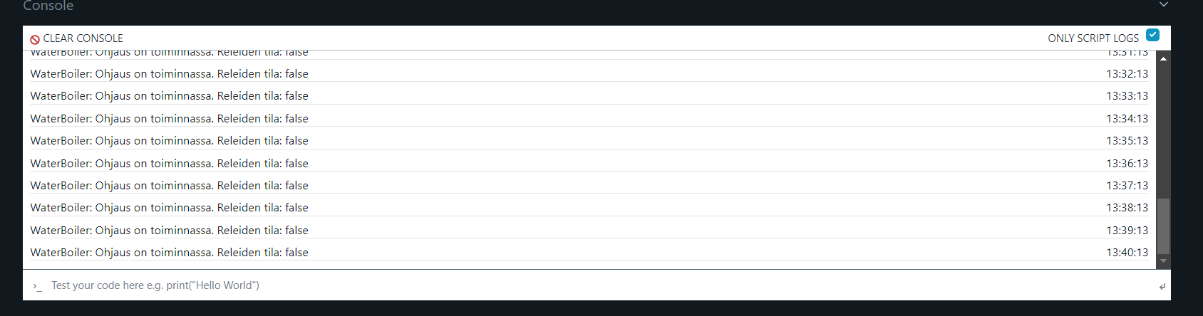 Oikeastaan jätin sen tarkoituksella että näkee skriptin olevan ohjaamopaikalla. Mutta tein nyt siihen vielä pienen lisäparannuksen, eli se nyt printtaa kahden minuutin välein viestin ja näyttää siinä tuon seuraavan tilamuutoksen ajankohdan: