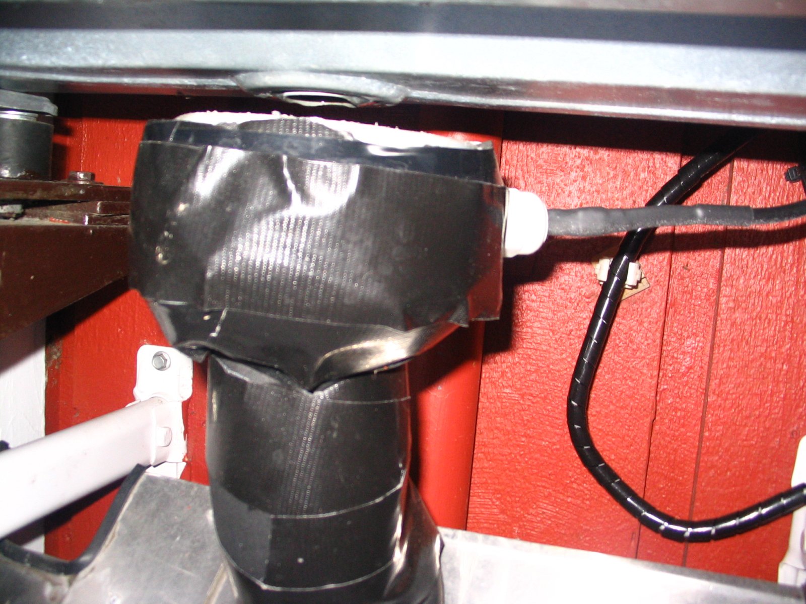 Pitää tuo putki vielä eristää. Sen sisällä menee tuo kaukalon sulatuskaapeli kaksinkerroin, kun oli sen verran pitkä.