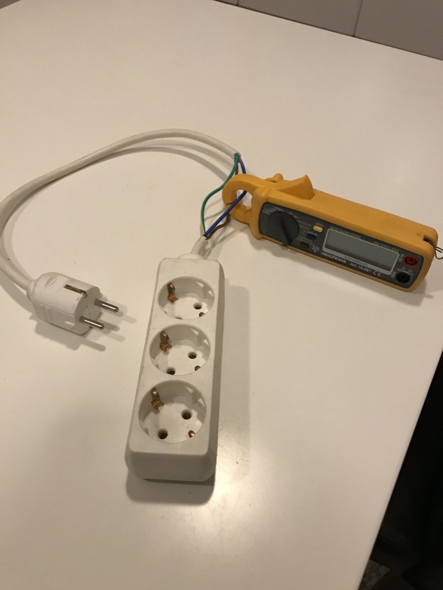 Meille amatööreille muistutuksena, että vaihtovirran mittaaminen pihtimittarilla vaatii aina sen että mittaus kohdistuu suoraan vaihejohtimeen. Jos yrittää mitata sähkölaitteen liitäntäjohdon ympäri, niin laitteelle menevän ja laitteelta palaavan virran magneettikentät kumoavat toisensa, ja mittari näyttää nollaa.