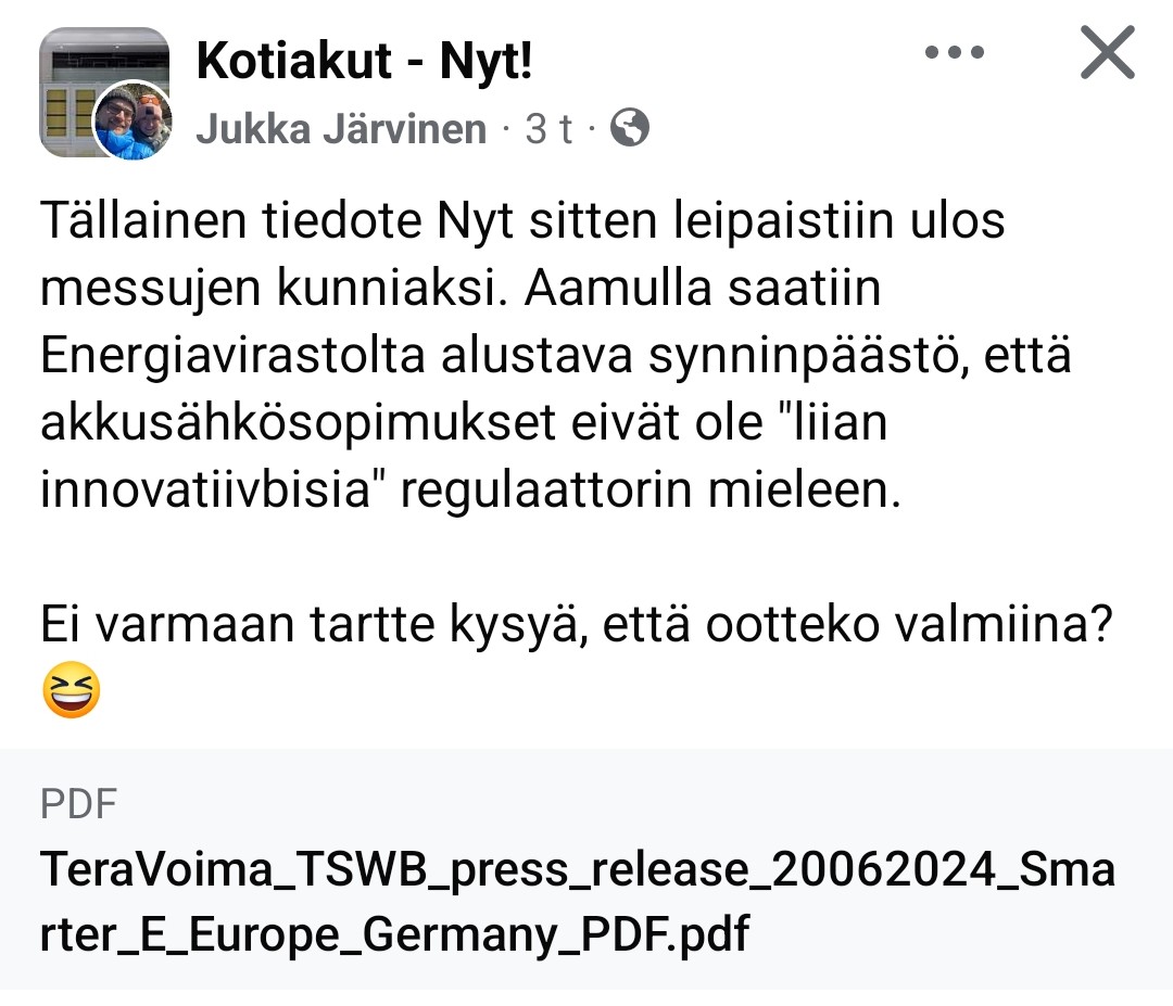 Vai meneekä tuo niin, että sähköliittymä irtisanotaan ja Teravoima hommaa tilalle uuden liittymän etäsähkövarastolle? Etäsähkövarastoa voinee jossakin määrin purkaa paikallisesti ilman erityisiä seurauksia (siis tuohonko idea perustuu?)? Mielenkiintoinen kysymys on, pääsisikö tuolla eroon sähköverostakin (siirtomaksusta varmaan pääsee?), mutta pitääkö kaikki tuo oikeusasteissa ja kuinka nopeasti tasavallan hallitus ja ministeriöt saadaan lobatuksi laatimaan uutta lainsäädäntöä verojen ym. liitännäisasioiden kiertämiseen?