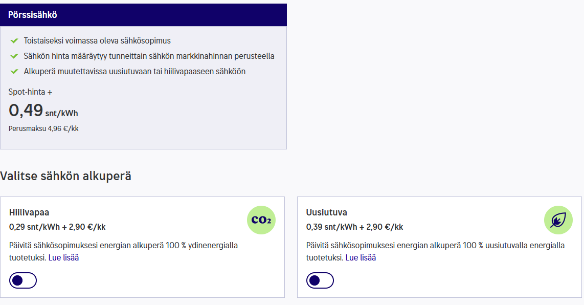 muttaolisi mielenkintoista kuulla millä sanoilla tuo myytiin. Varmaan joku loppukevennys: "Sopiiko että laitamme teille tulemaan uusiutuvaa sähköä?"