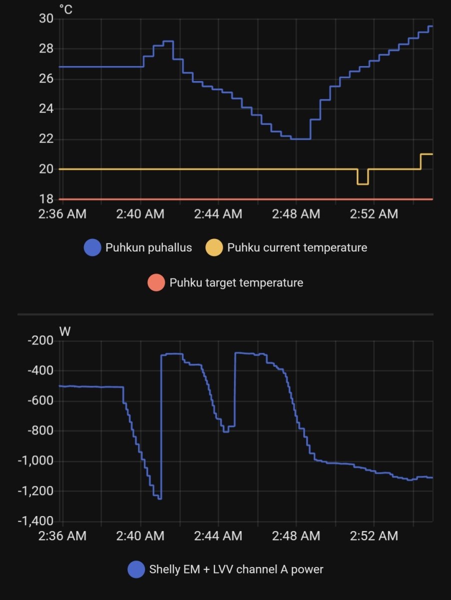 23 katkoili ja 22,5 lähti pyörimään pienellä teholla ja tippui sinne 22 asteeseen. Laitoin nyt lisää pyyntiä ja pitää vähän tarkkailla mitä muuten toimii.Mikä on sisälämpö kun pyynöasetus on 16+3 = 19C ?