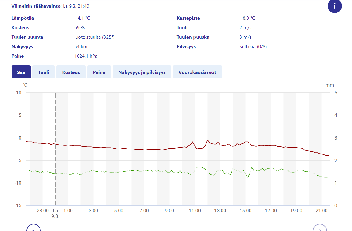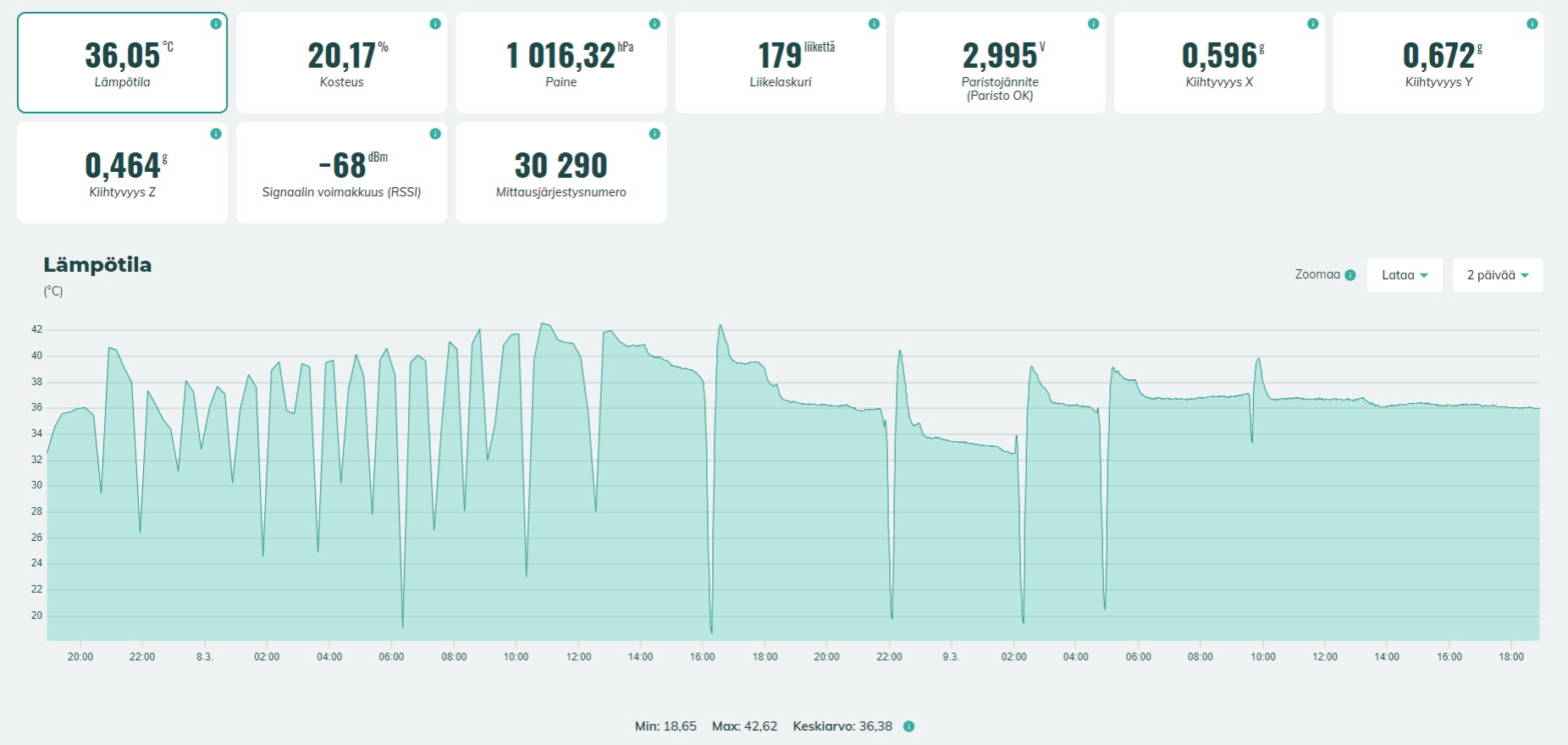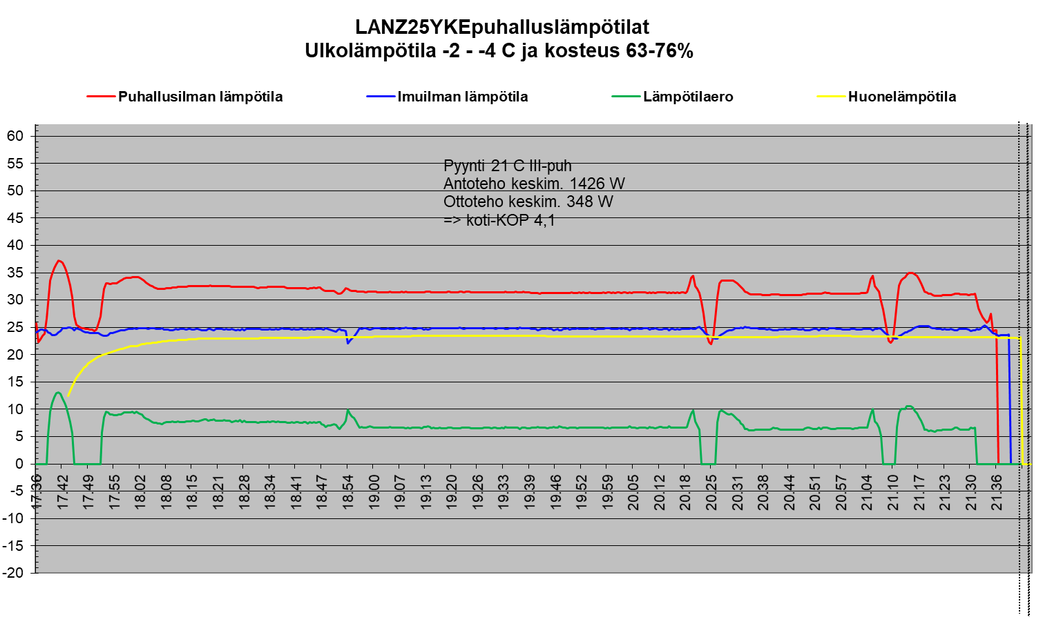 Mielenkiintoista nähdä yleensäottaenkin lämpödataa. Näitä ei ole tainnut osua varsinaisille harrastajille niin paljoa mitä Toshibaa ja Daikinia, kun katsoo minkälainen vilske ja loggauksen määrä niissä ketjuissa onEi kauheasti vielä osaa sanoa mitään vaikutuksesta, mutta kertaakaan ei ole tainnut sulattaa säädön jälkeen (ruuvitag mittaamassa puhallusaukolla). Keli nyt kuivaa aste-pari pakkasta eli ei kyllä tarvettakaan, mutta 4-6 tuntia on ollut pisimmät sulatusvälit mitä aiemmin havainnut. Pumpulle ei ole hetkellisen kulutuksen mittaria, mutta samassa vaiheessa ei pitäisi olla mitään valoja kummempaa näillä keleillä ja aika tasaista 500-600w viivaa piirtänyt koko päivän.