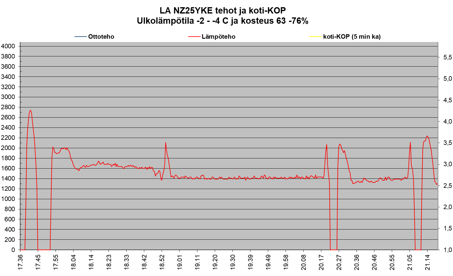 Laite ajeli katkoja tuossa, ei sulatuksia. Katkon kesto noin 3-4 min. Minimi ottoteho näin pikkupakkasilla tuntuisi olevan noin 330 W.