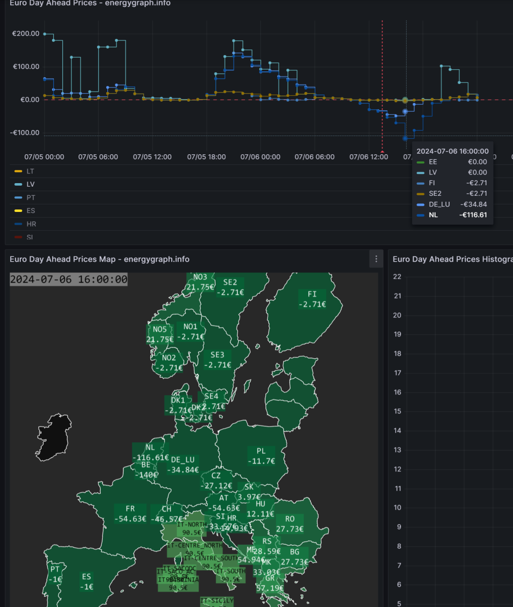 Ranskassakin sähkö -5,5 senttä / kWh. Ei ole enää kyse pienestä negatiivisesti hinnasta. Tuolla hintaa esim Carunan pääkaupunkiseudun verkossa siirron, sähköveron jälkeen sähkön hinta olisi aika lähelle nollaa. Hollannin hinnoilla kannattaisi jo pitää saunan kiuasta päällä :)