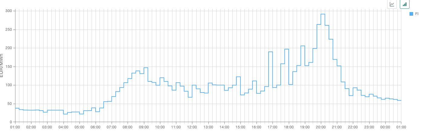 Nyt täytyy vaan toivoa että yöllä ei olisi isoja heittoja, kun auton lataus on ollut manuaalista tyyliin klo 01-06 2,5kW teholla. LVV on Elenian kautta, ja Elenia etsii halvimmat kolme tuntia välillä 00-07. Saas nähdä miten tuo menee jatkossa Elenialla, en ole vielä katsonut.