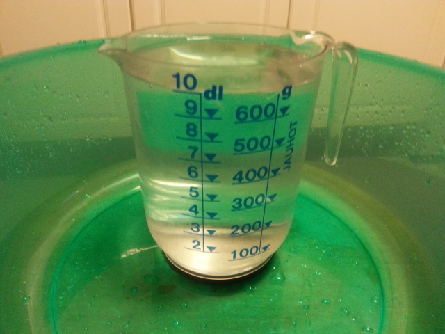 Lauhdeamme puhdas ja sulatuksen vesisaanto 405 g. Edellytti kolmen sulatusjakson seuraamista, koska ensimmäinen ei edes täyttänyt letkua, toisella tuli jotain ämpäriin ja kolmannella sain jo tuloksen. Setä käy käyntijaksot tässä lämpötilassa täysillä (90 r/s).