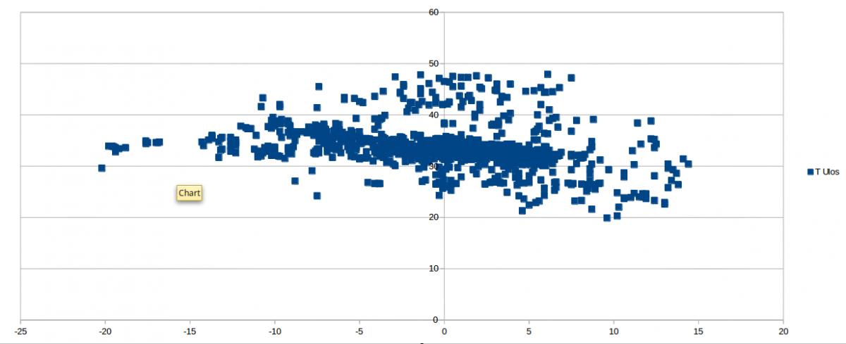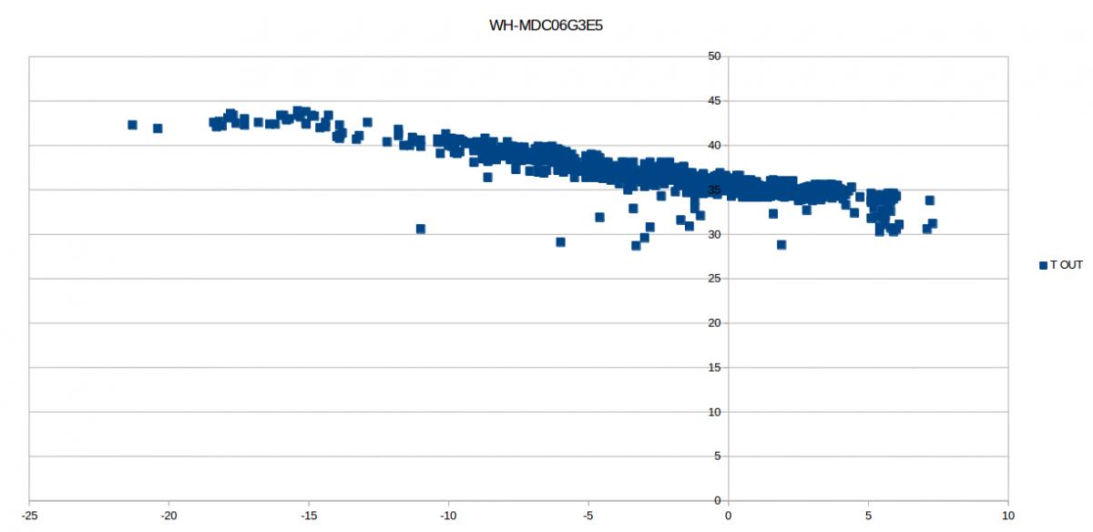 Joo, väärinkäsitysten välttämiseksi tässä kuvaajaa, josta näkee minkä lämpöstä vettä on tehty missäkin ulkolämpötilassa. Otokset on vähän satunnaisia, jolloin kuvaa sotkee käyttöveden teko, sulatukset ja pätkäkäynti lämpimillä keleillä. Siitä kuitenkin näkee, että tässä lattialämmitystalossa pumppu jaksaa nostaa lattiasta palaavan veden lämpöä lämmitystarpeenmukaisesti -10 ulkolämpötilaan asti, minkä jälkeen jatkaa edelleen lämmittämistä täydellä teholla. Puuttuva lämpö tehty sitten takalla. ILPpiäkin voidaan huutaa mukaan jos ei olla paikalla. Eikä talo silti välttämättä heti jäähdy vaikka olisikin päivän pari lämmittämättä muilla lämmönlähteillä.