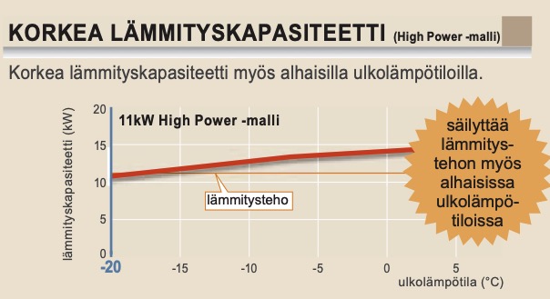 Tuo on kyllä liioittelua, että mylly huutaisi koko ajan 100% teholla. Pakkasilla talon tehontarve kasvaa lineaarisesti ja pumpun antotehot päinvastoin laskee. Pakkasten kirityessä se raja tietty tulee pienemmällä vastaan aikaisemmin. Täällä rannikolla kelit nollan kieppeillä 90% talvesta ja ajellaan pääsääntöisesti minimitehoilla. Tampereella on tietty jonkin verran kylmempää, joka vois puoltaa tehokkaampaa pumppua.