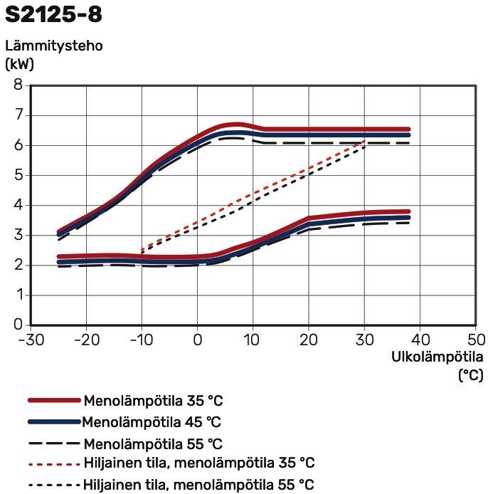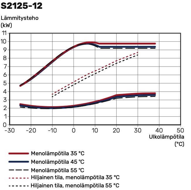 Okei, ehkä osittain totta. Hätäisesti lukien tuo tarkoittaa että riittää rintsikkaan. Voihan se 65 astetta tehdä mutta varmaan kuristaa omaa virtaamaansa sitten senkin edestä. Antotehokäyrän jyrkkä alamäki kuitenkin alkaa kun elohopea menee nollan alle. Nibe 8 kun antaa tehoja vajaa 3kW@-25C. Nibe 12 vastaavasti 4,7kW paikkeilla.