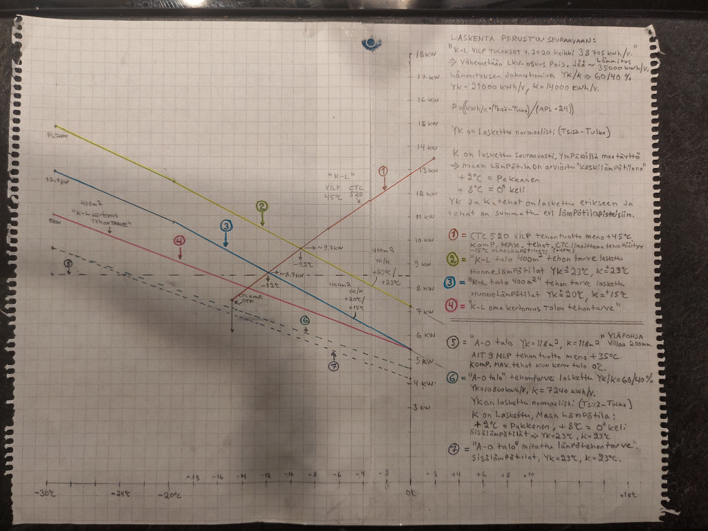 Ilmeisesti @jmaja on perehtynyt näiden laskemiseen. Nämäkin tulokset olisivat aika yhtenevät jos tuota kerrointa "24" vähän nostaisi - noin 30:een. Tuon kaavan mukaisia mitoituksia ei taida juuri vanhoista lämpöpumpulle saaneeratuista taloista löytyä ellei öljykattiloita lasketa mukaan. Uusissa taloissa voi sitten mennäkin melko lähelle kun mun lämpökuorman suhteellinen osuus kasvaa.