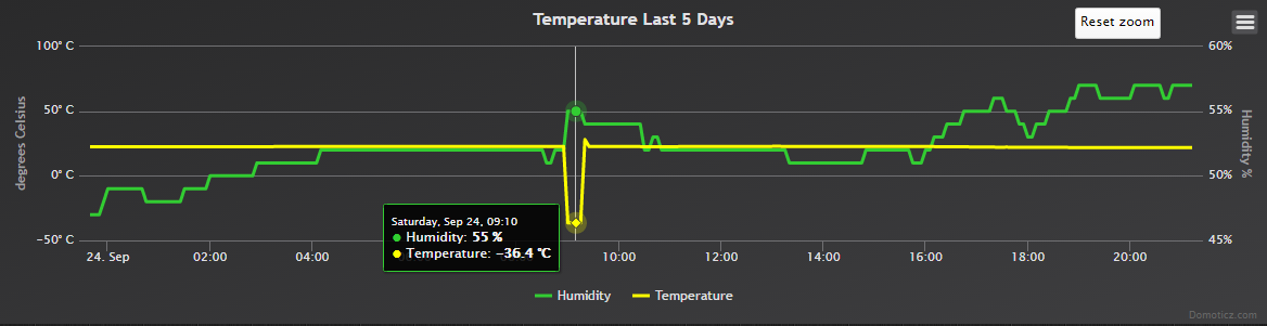 Itselle sekoilee nuo esic:n lämpötila-anturit. Ihan randomilla tulee häiriötä ja sisälämpötila saattaa niiden mukaan olla muutaman kymmenen astetta pakkasella. Ongelma tulee yleensä saunomisen jälkeen kun sisälämpö pomppaa sinne 23 asteen tietämille tai jos aurinko on päässyt paahtamaan lämpöä sisään. Seuraava projekti onkin korvata nuo kaikki MySensors-kilkkeillä jotta uskaltaa rakentaa automaatiota niiden lämpötilamittauksen varaan. Noita antureita on kolme. Eri aikaan ostettu ja kaikissa sama ominaisuus. Tiedä sitten johtuuko tuosta RFXtrx443e:stä..