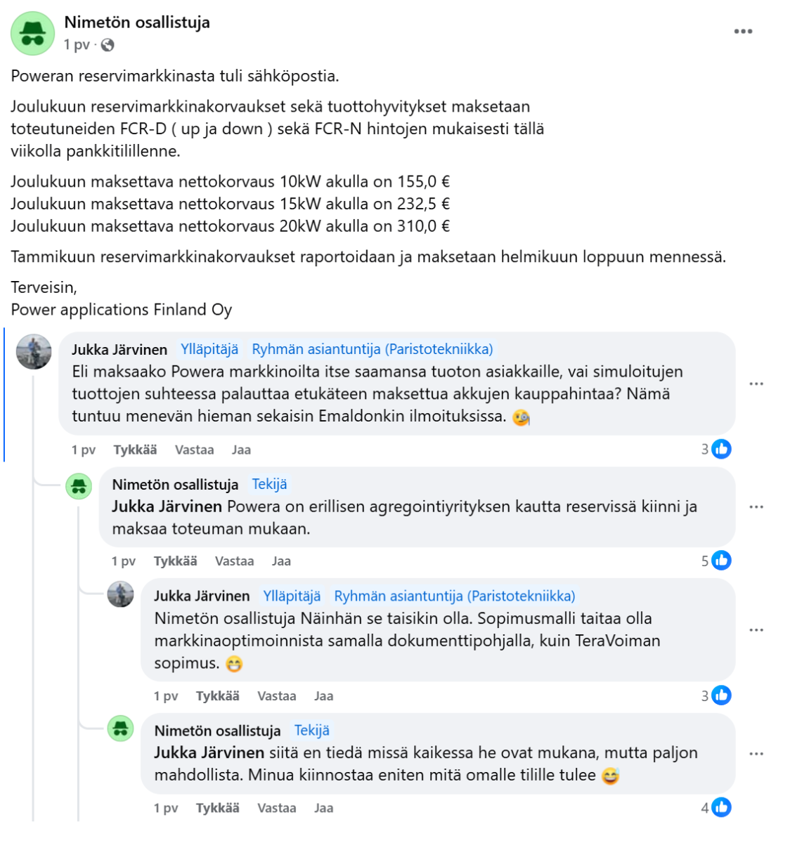 Tuli keskusteltua hepun kanssa joka taistellut fingridin suuntien että saisi laitteita reservimarkkinaan.